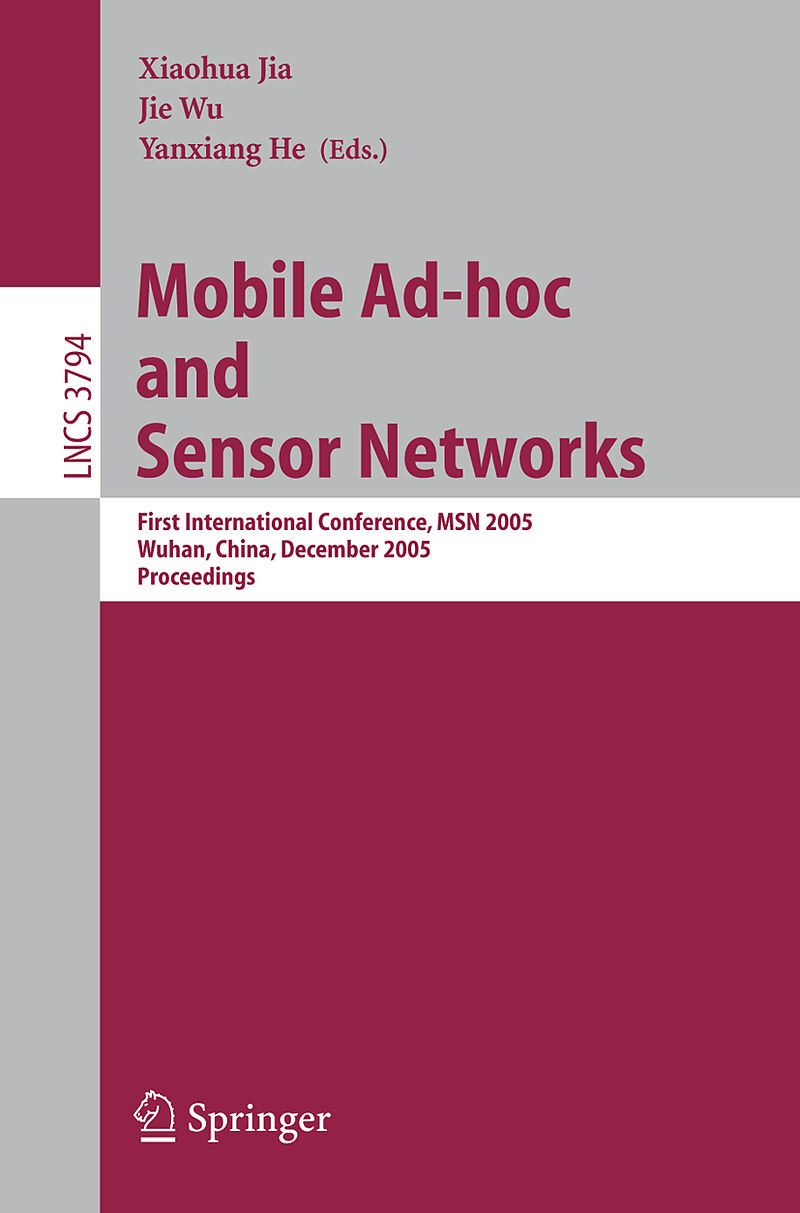 MSN 2005, the First International Conference on Mobile Ad-hoc and Sensor Networks, was held during 13-15 December 2005, in Wuhan, China. The conference provided a forum for researchers and practitioners to exchange research results and share development experi...MSN 2005, the First International Conference on Mobile Ad-hoc and Sensor Networks, was held during 13-15 December 2005, in Wuhan, China. The conference provided a forum for researchers and practitioners to exchange research results and share development experiences. MSN 2005 attracted 512 submissions (including the submissions to the Modeling and Security in Next Generation Mobile Information Systems (MSNG) workshop), among which 100 papers were accepted for the conf- ence and 12 papers were accepted for the workshop. We would like to thank the International Program Committee for their valuable time and effort in reviewing the papers. Special thanks go to the conference PC Vi- chairs, Ivan Stojmenovic, Jang-Ping Sheu and Jianzhong Li for their help in ass- bling the International PC and coordinating the review process. We would also like to thank the Workshop Chair, Dongchun Lee, for organizing the workshop. We would like to express our gratitude to the invited speakers, Laxmi Bhuya, Lionel Ni and Taieb Znati, for their insightful speeches. Finally, we would like to thank the Local Organization Chair, Chuanhe Huang, for making all the local - rangements for the conference. December 2005 Xiaohua Jia Jie Wu Yanxiang He Organization Steering Co-chairs Lionel Ni, Hong Kong University of Science and Technology, HKSAR Jinnan Liu, Wuhan University, PRC General Co-chairs Taieb Znati, University of Pittsburgh, USA Yanxiang He, Wuhan University, PRC Program Co-chairs Jie Wu, Florida Atlantic University, USA Xiaohua Jia, City University of Hong Kong, HKSAR Program Vice Chairs