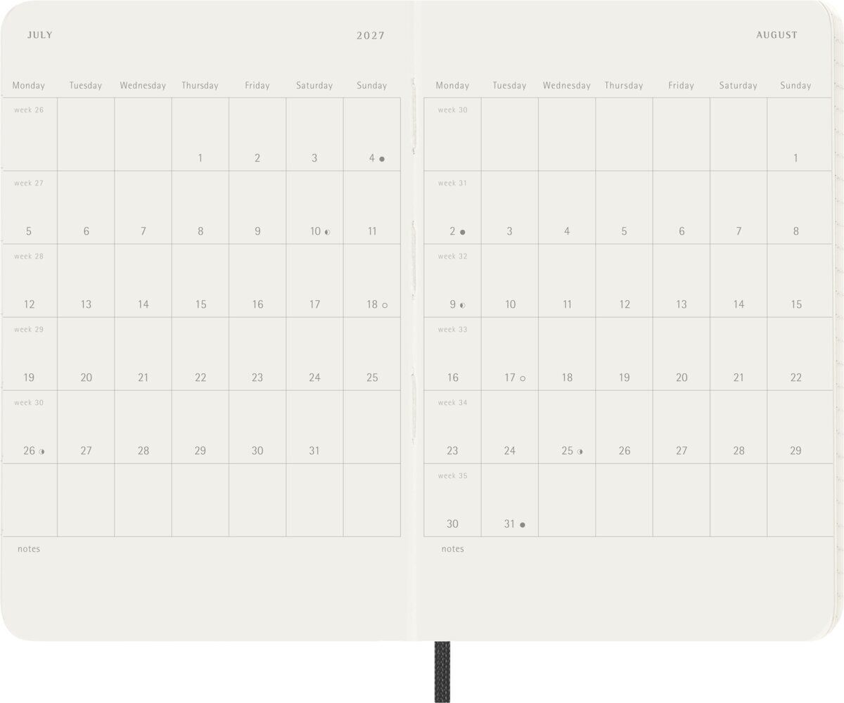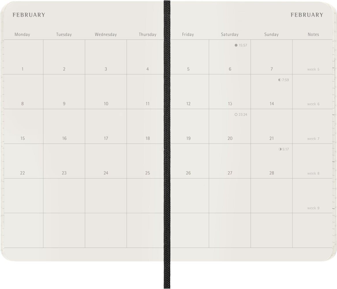 Der Moleskine Monats-Notizkalender ist von Januar bis Dezember datiert. Dieser Kalender zeigt jeden Monat auf zwei Seiten, gefolgt von einer linierten Doppelseite für Notizen zwischen den Monaten. 51 linierte Seiten am Ende des Kalenders bieten zusätzlichen Pl...