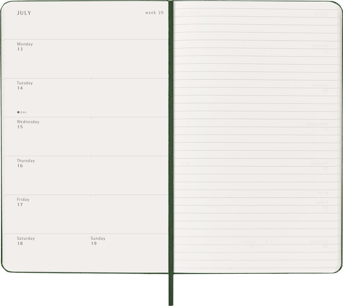 1 Wo = 1 Seite, rechts linierte Seite, Fester Einband. Klappentext Der Moleskine Wochenkalender reicht von Januar bis Dezember. Mit den Wochenterminen auf der linken Seite und einer linierten rechten Seite mit Platz für Notizen und Ideen ist dieses beliebte Ka...