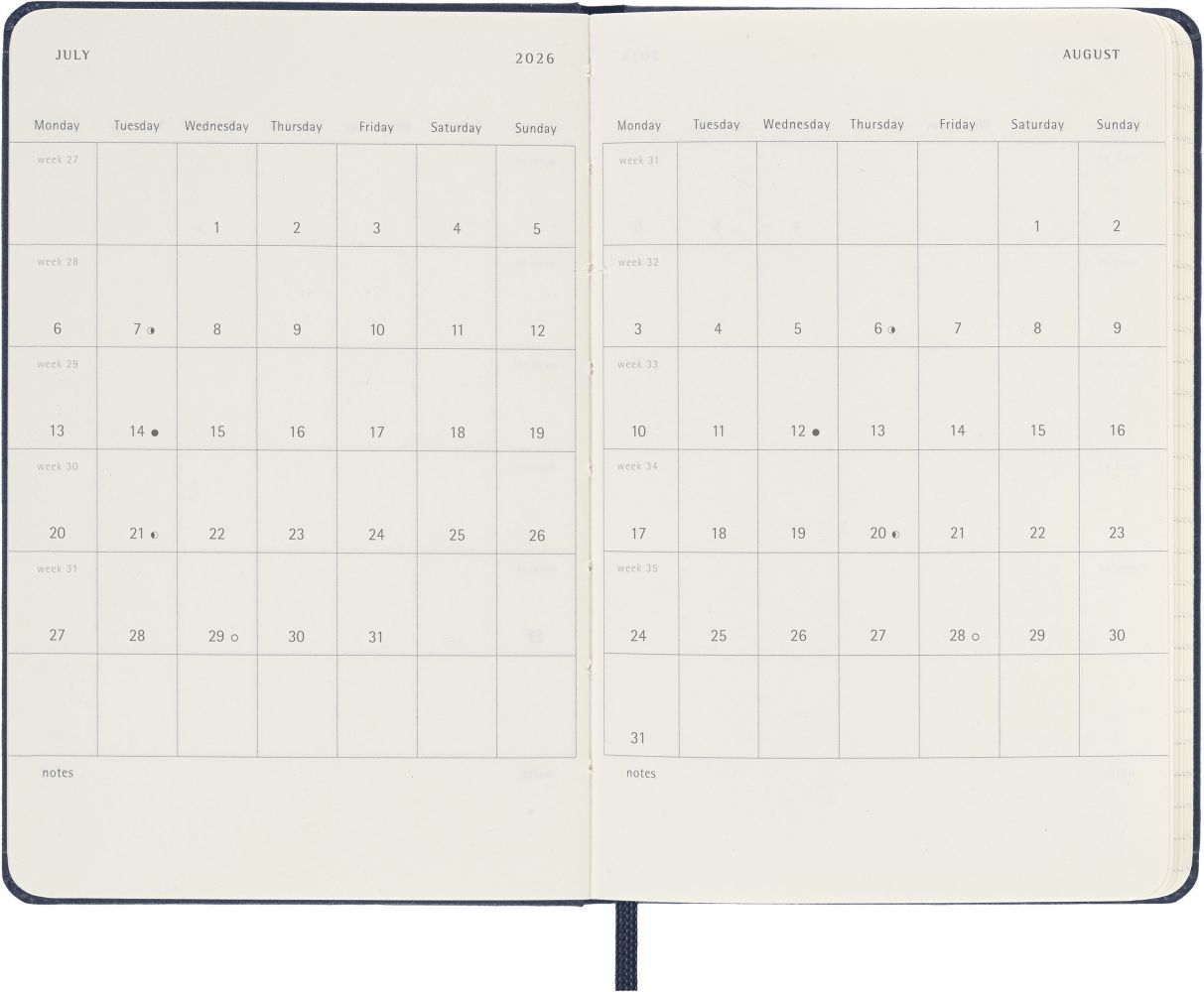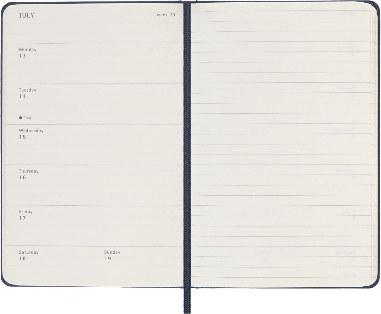 1 Wo = 1 Seite, rechts linierte Seite, Fester Einband. Klappentext Der Moleskine Wochenkalender reicht von Januar bis Dezember. Mit den Wochenterminen auf der linken Seite und einer linierten rechten Seite mit Platz für Notizen und Ideen ist dieses beliebte Ka...