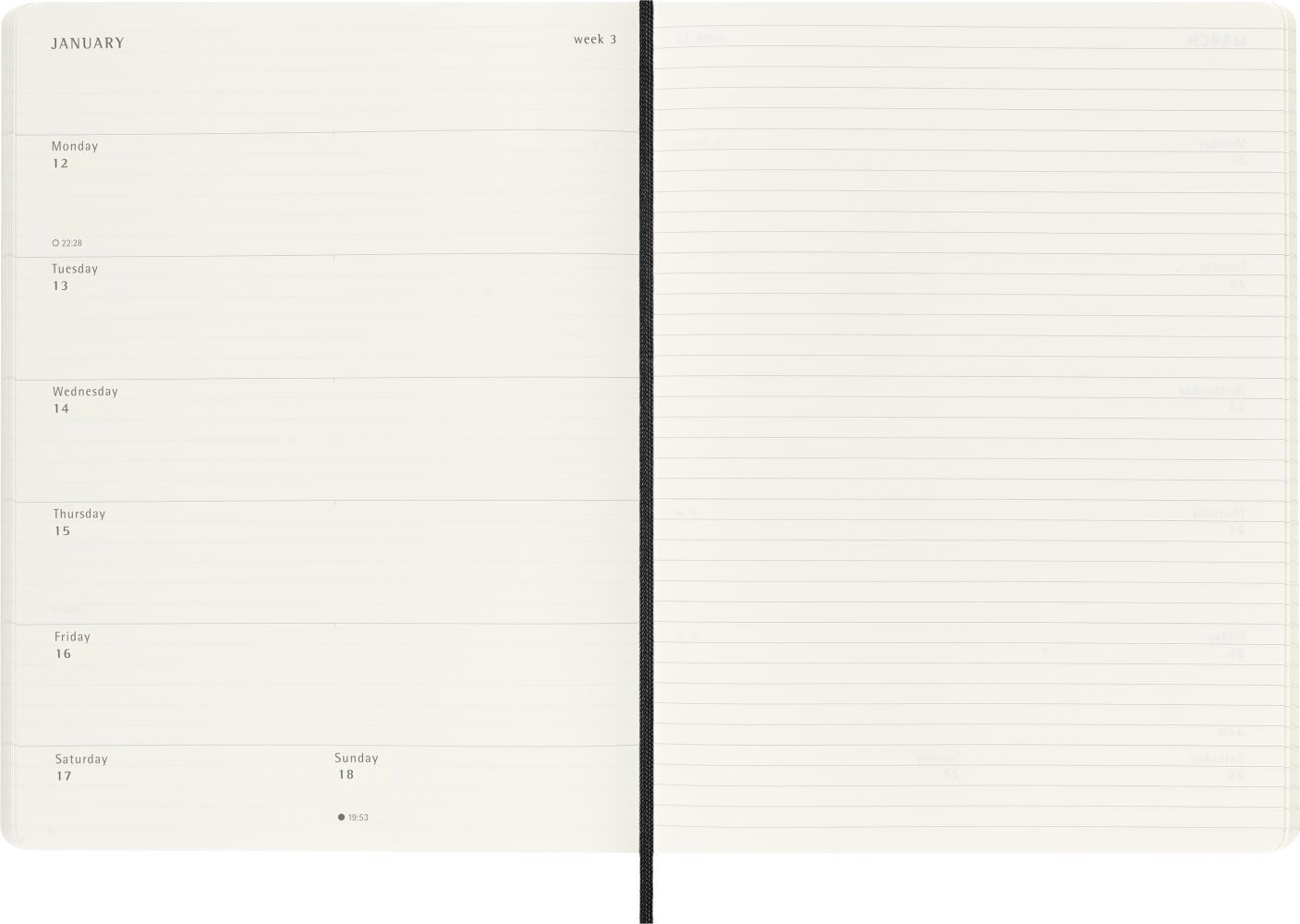 Moleskine 12 Monate Wochen Notizkalender 2026, XL, 1 Wo = 1 Seite, rechts linierte Seite, Weicher Einband, Schwarz