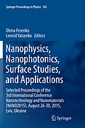 Part I: Nanoscale Physics.- Depolarised Rayleigh Light Scattering in the Ultrathin Krypton Layer Covering Graphite Surface: Computer Simulation.- Study of the Dynamics of 5CB Thin Layer Placed on the Fullerene Wall Computer Simulations.- Nanoindentation of DMPC-layer by Nanotubes of Various Diameters.- The Study of Properties of Paracetamol Clusters: MD Simulations.- Electric-driven Magnetization Dynamics Multilayer Nanostructures.- Phenomenological Models of Photoinduced Transition in Spin-crossover Materials.- Part II: Nanooptics and Photonics.- Nano-sized Pattern Formation in Non-equilibrium Adsorptive Systems with Interacting Adsorbate.- Kinetics of Transmission Through and Reflection from Interfaces in Nanostructures.- Modeling Optical Characteristics of Multilayer Nanoparticles of Different Size for Applications in Biomedicine.- Effect of Concentrated Light on Boron Nitride Nanostructures Formation.- Time-dependent Absorption Spectra of 1D, 2D Plasmonic Structures Obtained by the Ordering of Ag Nanoparticles in Polymer Matrix.- Part III: Nanostructured Interfaces and Surfaces.- Composite Coatings Formed Complex Methods.- Influence of Annealing in Vacuum on Kinetics of Dispersion-coagulation of Niobium and Hafnium Nanofilms Deposited onto Oxide Materials.- Colloid-Chemical Modification of Peloids with Nano- and Microparticles of Natural Minerals and Their Practical Use.- Anodic Nanostructuring of Titanium Oxide.- About Possibility of Quantum Interference Transitions and of Entanglement in Vacancies and Divacancies of Silicon.- Surface Pattern Formation in 2D System of Liquid Crystalline Molecules.- Non-equilibrium Plasma Assisted Hydrophase Ferritization in Fe 2 +-Ni 2 +-SO 4 2 --OH- System.- The Nature of Carbon Vacancies Initiating Graphite Oxidation.- Conditions of Spontaneous Growth of Iron Subnanocluster: The Influence of Impurity Atoms.- Large-scale Solution for Superhydrophobic Surfaces.- Comparison of Stability Properties of Nanozirconia Aqueous Suspension in the Presence of Selected Biopolymers.- Part IV: Nanochemistry and Biotechnology.- Hierarchical Structure of Derma Affected by Chemical Treatment and Filling with Bentonite:Diagnostics with a Method of Standard Contact Porosimetry.- Structured silicon surface via cavitation processing for the photovoltaic and biomedical application.- Molecular dynamics simulations of N-acetyl-p-aminophenol molecules embedded in high-density lipoprotein.- Computer simulations of homocysteine molecules embedded in high-density lipoprotein.- Comparative study of ferromagnetic and superparamagnetic iron oxide nanoparticles loaded with antitumor drug doxorubicin.- The effect of the synthesis conditions on morphology of tin (IV) oxide obtained be vapor transport method.- Effect of Aluminium-based colloid solutions on purification of products of sugar production.- Non-covalent functionalization of carbon nanotubes for efficient gene delivery.- Photocatalytic properties of semiconductor dye-polymer films.- Branched copolymers dextran-graft-polyacrylamide as nanocarriers for delivery of gold nanoparticles and photosensitizers to tumor cells.- Supercritical Water as NanoMedium for Gasification of Lignite-Water Suspension.- Coding of amino acids by nucleotides: consideration of the problem from point of physics of proteins.- Amine-functionalized nanospheres, synthesized using 1.2-bis (triethoxysilyl) ethane.- The influence of Cu Co nanoparticles on growth characteristics and biochemical structure of MENTA LONGIFOLIA in vitro.- Part V: Nanocomposites and Nanomaterials.- Gel nanocomposites with immobilized bioelements for plant nutrition.- Nanocomposites based on multicomponent polymer matrices and nanofiller densil for biomedical application.- Effects of dispersion and ultraviolet/ozonolysis functionalization of graphite nanoplatelets on the electrical properties of epoxy nanocomposites.- Polymer nanocomposite for the active layerof organic photovoltaics.- Effect of mechanochemical treatment of cellulose on characteristics of nanocellulose films.- Electrical and thermoelectric properties of the composite polytetrafluoroethylene-multi-walled carbon nanotubes.- Iron oxides and their silica nanocomposites as biocompatible systems for biomedical applications.- Low temperature stages formation of interface composition systems Cu-Y-Zr-O.- Oxidation resistance of materials based on Ti 3 AlC 2 nanolaminate at 600 °C in air.- Self-propagating high-temperature synthesis (SHS): a simple route to carbon-related nanomaterials.- Influence of treatment temperature on microstructure and properties of YSZ-NiO anode materials.