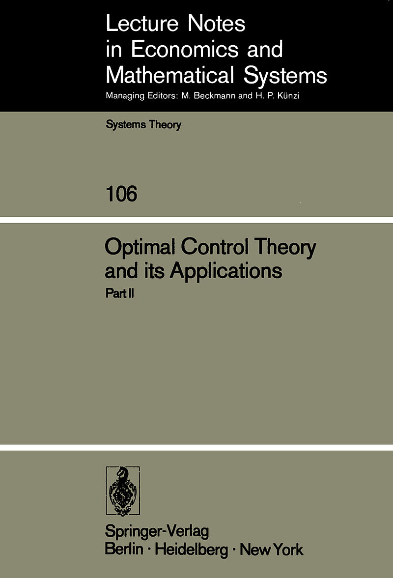 This work (in two parts), Lecture Notes in Economics and Mathe matical Systems, Volume 105 and 106, constitutes the Proceedings of the Fourteenth Biennual Seminar of the Canadian Mathematical Congress, which was held from August 12 to August 25, 1973 at the Un...This work (in two parts), Lecture Notes in Economics and Mathe matical Systems, Volume 105 and 106, constitutes the Proceedings of the Fourteenth Biennual Seminar of the Canadian Mathematical Congress, which was held from August 12 to August 25, 1973 at the University of Western Ontario, London, Ontario. The Canadian Mathematical Congress has held Biennual Seminars since 19~7, and these have covered a wide range of topics. The Seminar reported in this publication was concerned with "Optimal Control Theory and its Applications", a subject chosen for its active ~rowth and its wide implications for other fields. Both these aspects are exemplified in these Proceedings. Some lectures provided excellent surveys of particular fields whereas others concentrated on the presentation of new results. There were six distinguished Principal Lecturers: H.T. Banks, A.R. Dobell, H. Halkin, J.L. Lions, R.M. Thrall and W.M. Wonham, all of whom gave five to ten lectures during the two weeks of the Seminar. Except for Dr. Dobell's, these will all be found in Volume 105. Besides the Principal Lecturers there were three Guest Lecturers: M.C. Delfour, V. Jurdjevic and S.P. Sethi, who presented substantial bodies of material in two or three lectures and which are included in Volume 106. Many of the participants also spoke and reports of ~0st of these have also been included (Volume 106).
