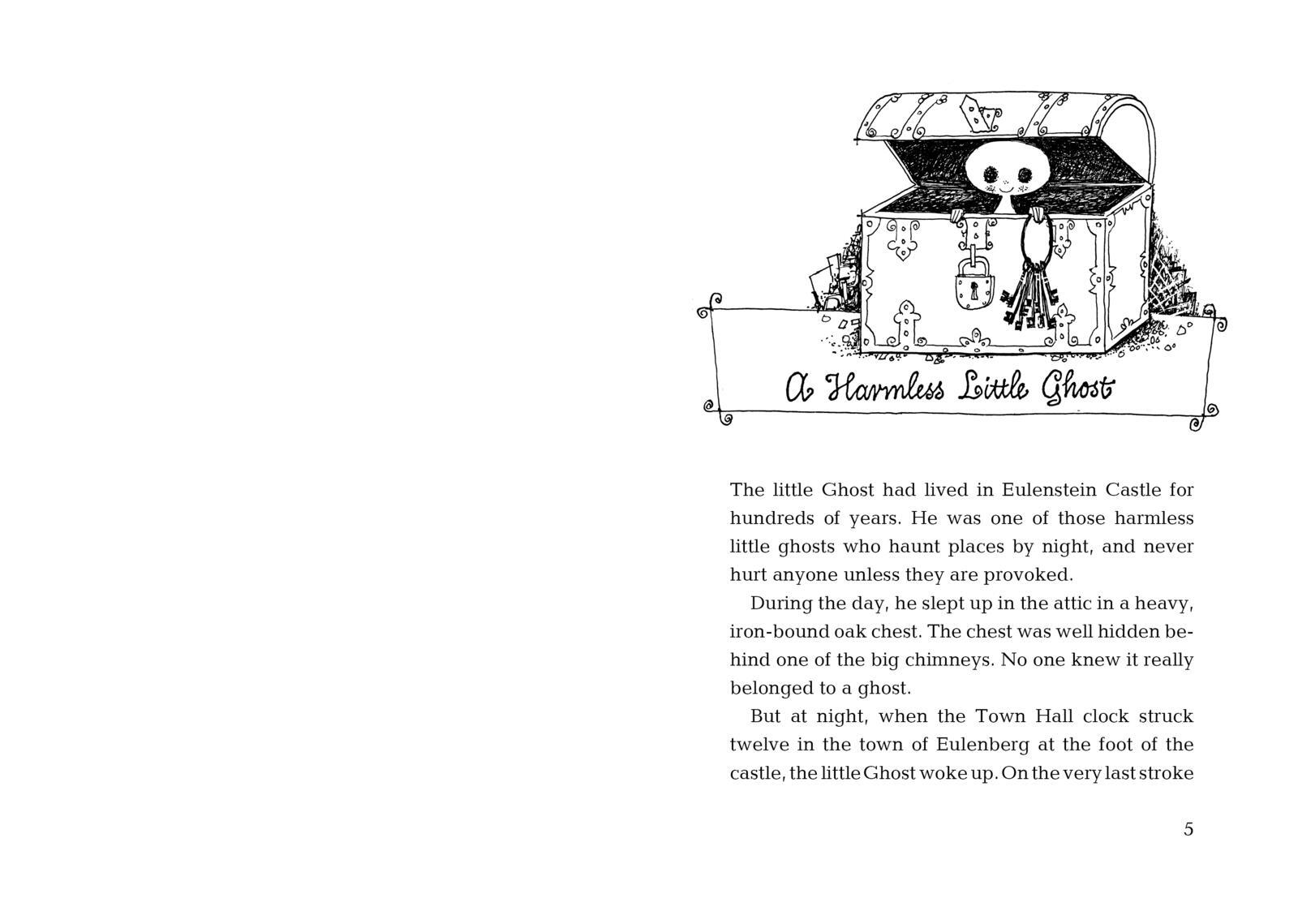 But at night, when the Town Hall clock struck twelve in the town of Eulenberg at the foot of the castle, the little ghost awakened. On the very last stroke of twelve, he would open his eyes, stretch and yawn.