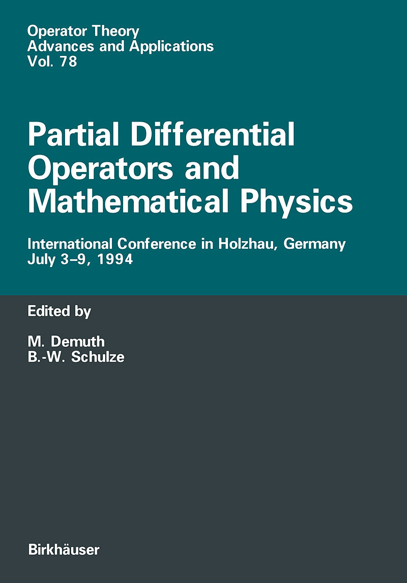 This volume contains the proceedings of the International Conference on "Par tial Differential Equations" held in HolzhaujErzgebirge, Germany, July 3~9, 1994. The conference was sponsored by the Max-Planck-Gesellschaft, the Deutsche For schungsgemein...This volume contains the proceedings of the International Conference on "Par tial Differential Equations" held in HolzhaujErzgebirge, Germany, July 3~9, 1994. The conference was sponsored by the Max-Planck-Gesellschaft, the Deutsche For schungsgemeinschaft, the Land Brandenburg and the Freistaat Sachsen. It was initiated by the Max-Planck-Research Group "Partielle Differential gleichungen und Komplexe Analysis" at the University of Potsdam as one of the annual meetings of the research group. This conference is part of a series begun by the former Karl-Weierstraf3-Institute of Mathematics in Berlin, with the confer ences in Ludwigsfelde 1976, Reinhardsbrunn 1985, Holzhau 1988 (proceedings in the Teubner Texte zur Mathematik 112, Teubner-Verlag 1989), Breitenbrunn 1990 (proceedings in the Teubner Texte zur Mathematik 131, Teubner-Verlag 1992), and Lambrecht 1991 (proceedings in Operator Theory: Advances and Applications, Vol. 57, Birkhiiuser Verlag 1992); subsequent conferences took place in Potsdam in 1992 and 1993 under the auspices of the Max-Planck-Research Group "Partielle Differentialgleichungen und Komplexe Analysis" at the University of Potsdam. It was the intention of the organizers to bring together specialists from differ ent areas of modern analysis, geometry and mathematical physics to discuss not only recent progress in the respective disciplines but also to encourage interaction between these fields. The scientific advisory board of the Holzhau conference consisted of S. Al beverio (Bochum), L. Boutet de Monvel (Paris), M. Demuth (Clausthal), P. Gilkey (Eugene), B. Gramsch (Mainz), B. Helffer (Paris), S.T. Kuroda (Tokyo), B.-W. Schulze (Potsdam).