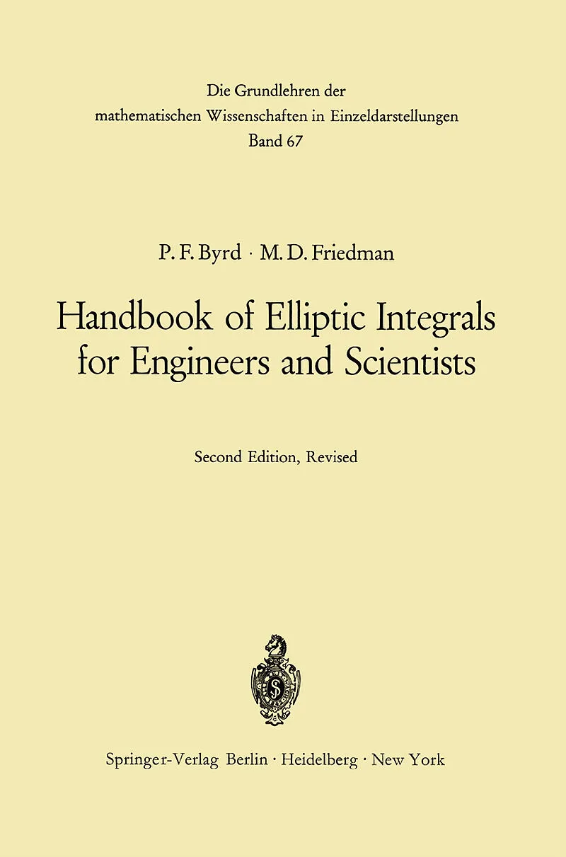 Definitions and Fundamental Relations.- 110. Elliptic Integrals.- 120. Jacobian Elliptic Functions.- 130. Jacobi's Inverse Elliptic Functions.- 140. Jacobian Zeta Function.- 150. Heuman's Lambda Function.- 160. Transformation Formulas for Elliptic Functions and Elliptic Integrals.- Reduction of Algebraic Integrands to Jacobian Elliptic Functions.- 200. Introduction.- 210. Integrands Involving Square Roots of Sums and Differences of Squares.- 230. Integrands Involving the Square root of a Cubic.- 250. Integrands Involving the Square root of a Quartic.- 270. Integrands Involving Miscellaneous Fractional Powers of Polynomials.- Reduction of Trigonometric Integrands to Jacobian Elliptic Functions.- Reduction of Hyperbolic Integrands to Jacobian Elliptic Functions.- Tables of Integrals of Jacobian Elliptic Functions.- 310. Recurrence Formulas for the Integrals of the Twelve Jacobian Elliptic Functions.- 330. Additional Recurrence Formulas.- 360. Integrands Involving Various Combinations of Jacobian Elliptic Functions.- 390. Integrals of Jacobian Inverse Elliptic Functions.- Elliptic Integrals of the Third Kind.- 400. Introduction.- 410. Table of Integrals.- Table of Miscellaneous Elliptic Integrals Involving Trigonometric or Hyperbolic Integrands.- 510. Single Integrals.- 530. Multiple Integrals.- Elliptic Integrals Resulting from Laplace Transformations.- Hyperelliptic Integrals.- 575. Introduction.- 576. Table of Integrals.- Integrals of the Elliptic Integrals.- 610. With Respect to the Modulus.- 630. With Respect to the Argument.- Derivatives.- 710. With Respect to the Modulus.- 730. With Respect to the Argument.- 733. With Respect to the Parameter.- Miscellaneous Integrals and Formulas.- Expansions in Series.- 900. Developments of the Elliptic Integrals.- 907.Developments of Jacobian Elliptic Functions.- 1030. Weierstrassian Elliptic Functions and Elliptic Integrals.- Definition, p. 308. Relation to Jacobian elliptic functions, p. 309. Fundamental relations, p. 309. Derivatives, p. 309. Special values, p. 310. Addition formulas, p. 310. Relation to Theta functions, p. 310. Weierstrassian normal elliptic integrals, p. 311. Other integrals, p. 312. Illustrative example, p. 313..- 1050. Theta Functions.- Definitions, p. 315. Special values, p. 316. Quasi-Addition Formulas, p.317. Differential equation, p. 317. Relation to Jacobian elliptic functions, p. 318. Relation to elliptic integrals, p. 318..- 1060. Pseudo-elliptic Integrals.- Definition, p. 320. Examples, p. 321..- Table of Numerical Values.- Supplementary Bibliography.