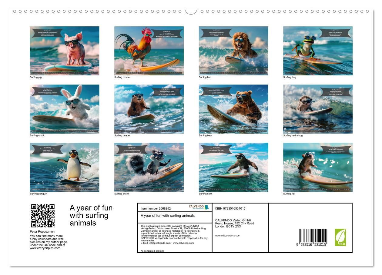 Immerse yourself in the world of waves with our unique annual calendar 'A year of fun with surfing animals'. Each month you can expect a new, adorable AI-generated image of animals mastering the art of surfing. From determined lions riding the perfect wave to ...