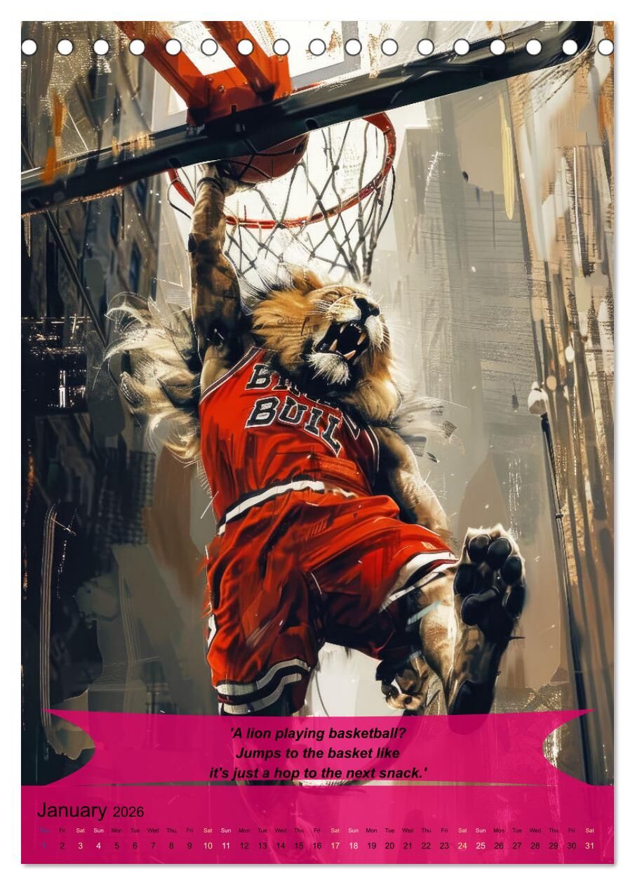 Dunk into the new year with our Basketball with Funny Animals calendar. Each month, be greeted by AI generated funny animals in a basketball position. Paired with hilarious quotes that blend the thrill of basketball with the whimsical charm of our animal athle...