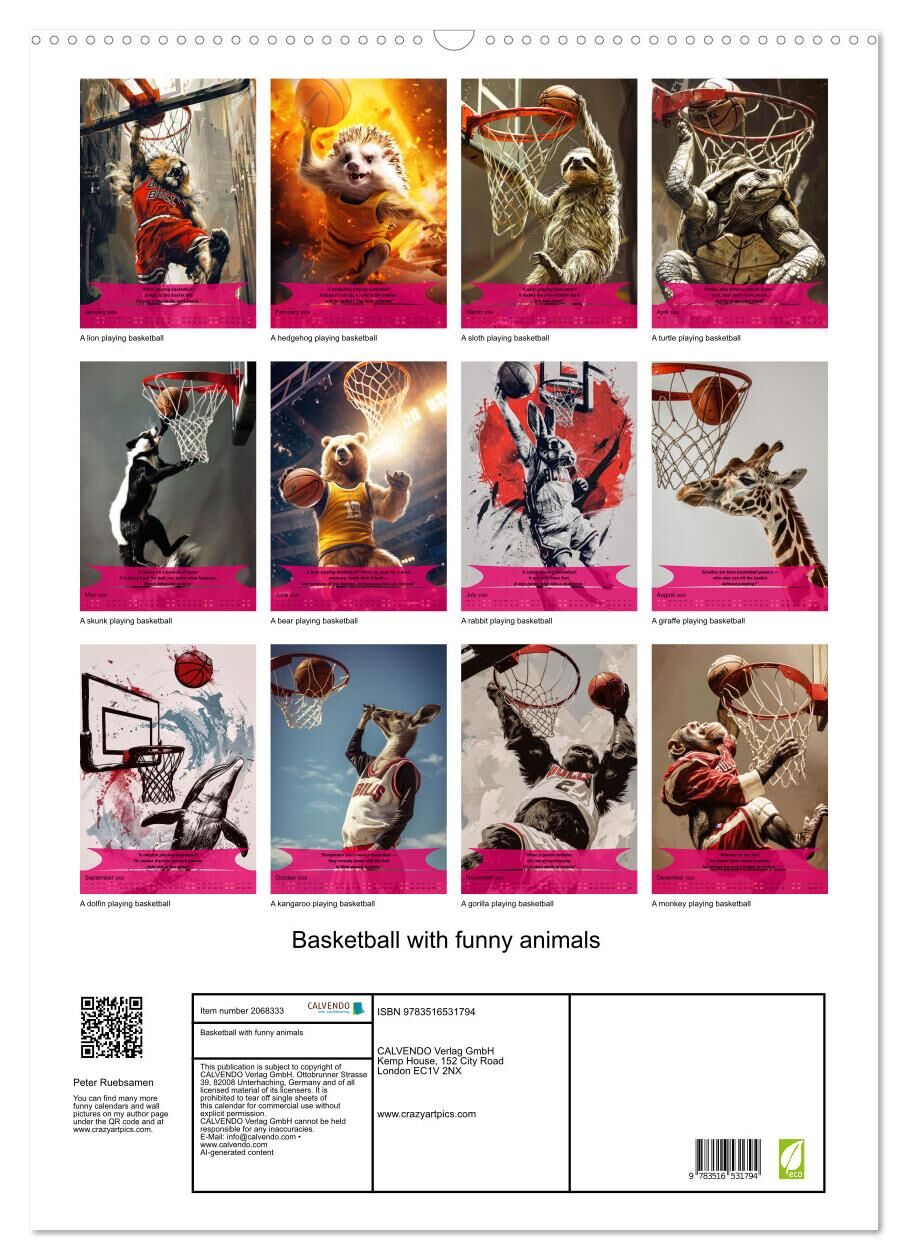 Dunk into the new year with our Basketball with Funny Animals calendar. Each month, be greeted by AI generated funny animals in a basketball position. Paired with hilarious quotes that blend the thrill of basketball with the whimsical charm of our animal athle...