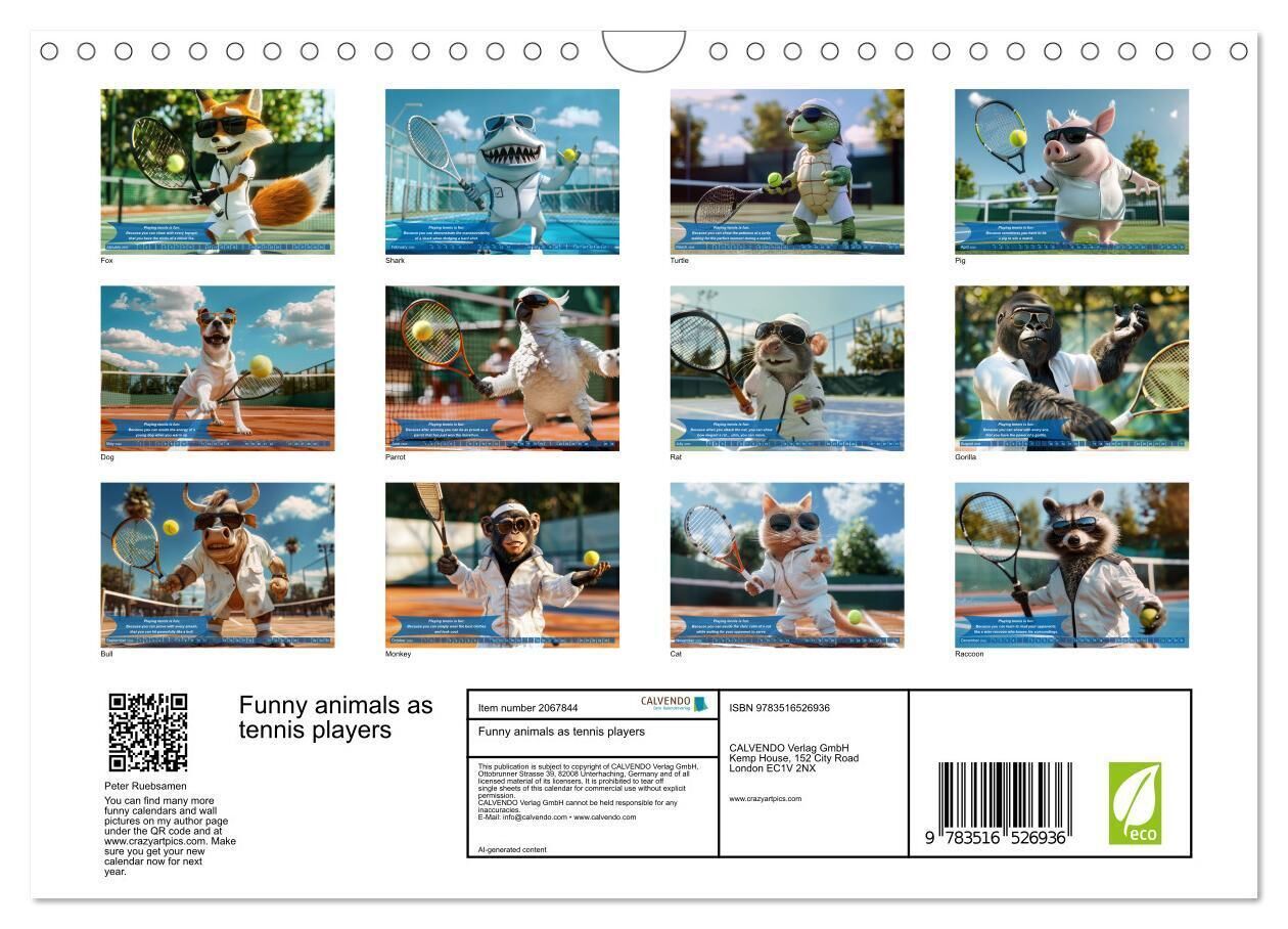 Serve up smiles all year round with our exclusive 'Funny Animals as Tennis Players' annual calendar. Each month, discover a new, hilarious animal decked out in tennis gear, ready to hit the court. These AI generated whimsical creatures bring a playfu...