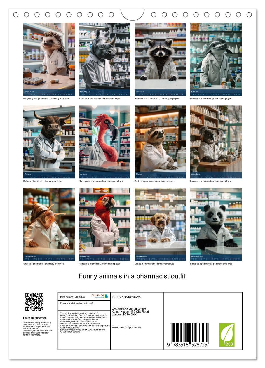 As a pharmacist or employee, discover the unique annual calendar 'Funny animals in a pharmacist outfit' that will fill your year with laughter and joy. Immerse yourself month after month in a world full of humour in which animals and pharmacists play the leadi...