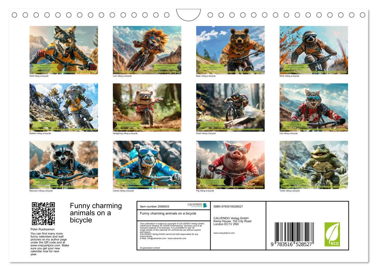 Discover the ultimate annual companion for any cycling enthusiast. 'Funny charming animals on a bicycle'. With a unique collection of humorous quotes and AI-generated adorable images of animals on bikes, this calendar is more than just a date display. It's a d...