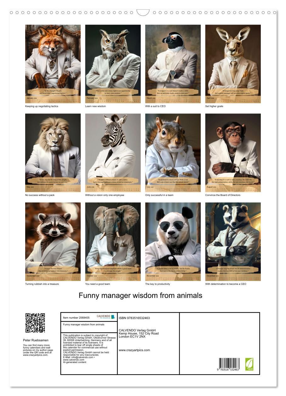 Immerse yourself in the world of funny manager wisdom. Your indispensable companion throughout the year. This unique annual calendar combines humorous management quotes with charming illustrations of animals in business suits. Every month you will find a new p...