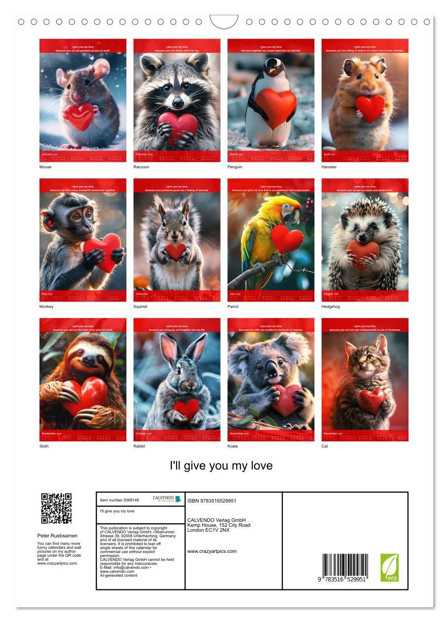 Unveil a year of affection with our exclusive 'I'll Give You My Love' calendar. Each month reveals a heartwarming scene of AI generated adorable animals, each captured in a moment of pure love, with a heart symbolizing the unspoken bond between them. Perfect f...