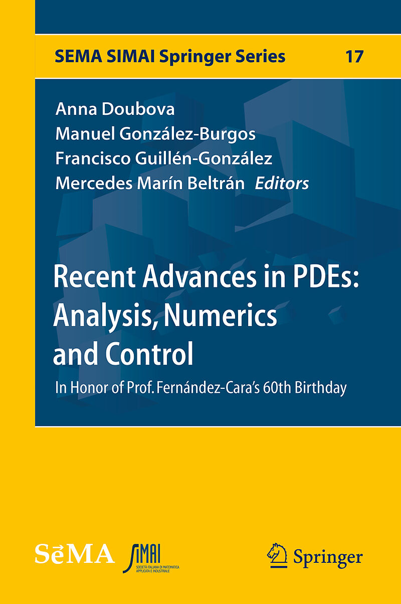 This book contains the main results of the talks given at the workshop Recent Advances in PDEs: Analysis, Numerics and Control, which took place in Sevilla (Spain) on January 25-27, 2017. The work comprises 12 contributions given by high-level researchers in ...This book contains the main results of the talks given at the workshop Recent Advances in PDEs: Analysis, Numerics and Control, which took place in Sevilla (Spain) on January 25-27, 2017. The work comprises 12 contributions given by high-level researchers in the partial differential equation (PDE) area to celebrate the 60th anniversary of Enrique Fernández-Cara (University of Sevilla). The main topics covered here are: Control and inverse problems, Analysis of Fluid mechanics and Numerical Analysis. The work is devoted to researchers in these fields.