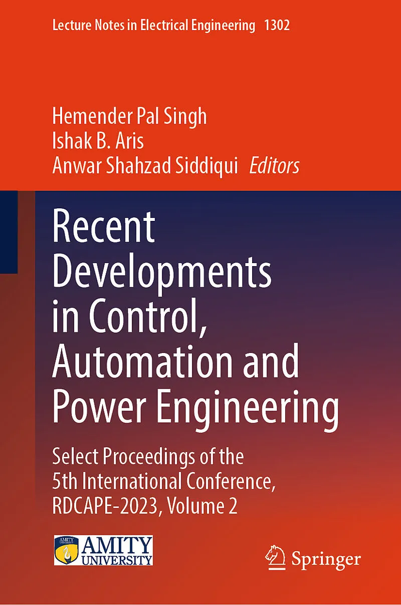 Automatic Parallel Parking Car.- Analysis of Hand Shapes with Convolutional Neural Networks for Sign Language Recognition.- Performance Evaluation of Load Balancer in Storage Level Service Offering Applications.- A Comparative Study of Poisson Algorithm and other Surface Reconstruction Techniques for 3D Modeling from 2D Images.- Optimal scheduling of vehicle-to-grid power exchange using hybrid BPSO and GSA approach.- Smooth Imaging System Using Learning Generative Adversarial Network.- Encoding Data using Slayer Exciter Circuits with Simultaneous Power and Information Transmission.- Design, Analysis of Dual-Band Rectenna for Internet of Things Applications.- A Study of an Efficient Edge Detection Approach with Machine Learning Techniques.- Wireless EV Charging Station using Weight Sensor.- Universal Filters based on Bulk-driven CCII for Low Voltage Analog Applications.- Neural networks-based control framework for teleoperation system.- Reinforcement Learning in Simultaneous localization and mapping.- Comparative performance analysis of PV system in Island mode using MPPT Fuzzy logic controller and Perturb & Observe Algorithm.- Comparative Analysis of SOC Prediction Using Machine Learning Algorithms.- PLC-SCADA based automation system for remote and sensitive areas.- Analyzing the Performance of Fuzzy tunned PID Control of Anti-Lock Braking System.- Design and Implementation of An Automated Conveyor Belt System with Speed Control, Size Sortation and IoT Data Publication.- Investigating Quantum-inspired Evolutionary Algo-rithm with Restarts for Solving IEEE CEC 2022 Benchmark Problems.- ANN based Control Strategy for Automatic Generation Control in Interconnected Power Systems.- State of Charge Estimation of Electric Power Battery using ANN Technique.- "Discrete-Time Realization of Fractional-Order.- Proportional Integral Controller for First-Order Plus Time Delay Plant.- Energy Management System for Sustainable Energy Sources Using Hybrid Approaches.- ANFIS controlled hybrid renewable source system for optimal power sharing.- Robust Sliding Mode Controller for Flyback Converter in Continuous Conduction Mode.- An employment of PID controller based genetic algorithm for the load frequency control of two-area power system network.- Order Reduction of Linear dynamic System Using Recursive Pole Array Technique and Pade Ap-proximation.- Power Generation from Food and Garden Waste in Educational Institute.- Modeling and Performance Analysis of a Model Predictive and Feedback Linearization Controlled UAV Autonomous Quadcopter Drone in 3D Dynamics.- GA Optimization Methods for Charging of Electric Vehicles by Scheduling the Load of Home Appliances.- Design of Type Compensators Using K-factor Method.- Placement and Sizing of Distributed Generation using MELGWO Algorithm in Distribution Networks.- Stability Preservation Technique for Order Reduction of z-domain Interval Structure.- Pregnancy, postpartum hemorrhage management sys-tem using IoT.- Analyzing the Link-Lifetime And Doppler Shift Between Connected Vehicles in Vanet.- Comparative Analysis of Short-Term Load Forecasting Techniques: Conventional Deep Learning Models vs. Proposed LSTM with Attention Layers.- Colorization Of Grayscale Images Using GAN With ResNet As The Backbone.- Development of Electrical Power Train for Conversion of Motorcycle with an Internal Combustion (IC) Engine to an Electric Bike.- Belief reliability evaluation of F-18 LLF system by disjoint method.