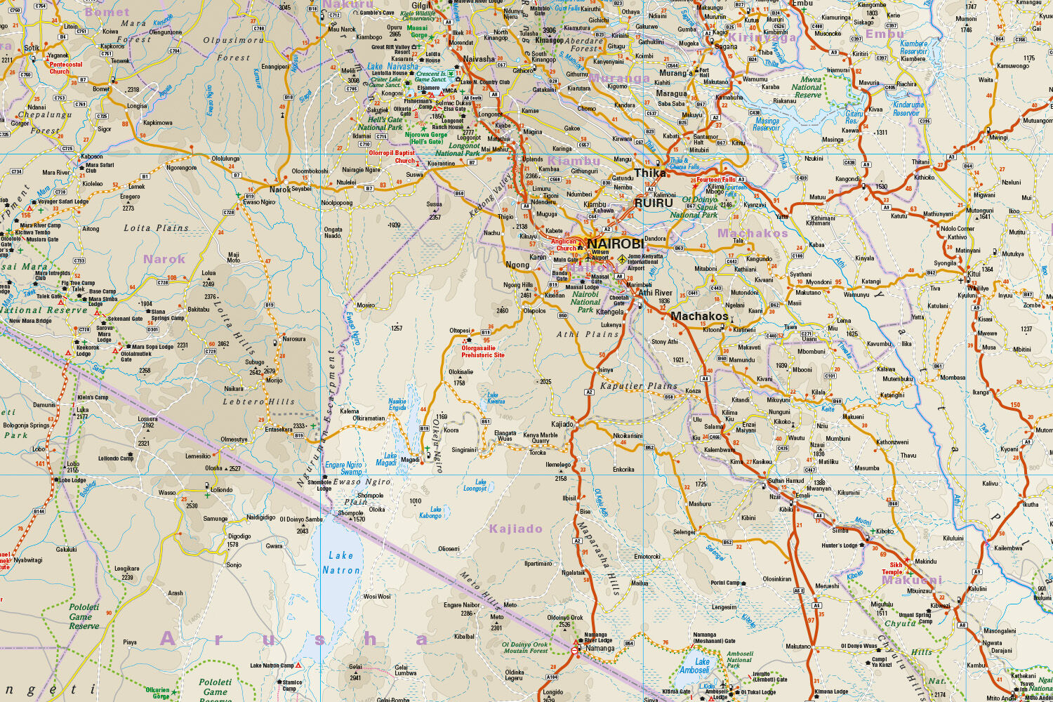 Ob mit dem Auto, dem Motorrad oder dem Fahrrad: Diese robuste Outdoor-Karte aus Polyart® hält extremem Wetter und intensiver Nutzung stand, ohne dass eine Schutzhülle erforderlich ist. Durch ihre matte Oberfläche ist sie auch bei starker Sonne gut lesbar und kann problemlos mit Bleistift und Textmarker beschrieben werden. Der abnehmbare Pappumschlag macht die Karte faltbar und kompakt ideal für den schnellen Zugriff in der Fahrradtasche, im Tankrucksack oder Handschuhfach. Die kartographische Darstellung ist präzise, zuverlässig und gut lesbar. So ist die Straßenkarte Kenia genau auf die Bedürfnisse Reisender zugeschnitten.