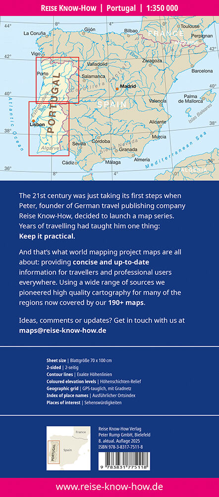 Hochreißfeste und 100% wasserfeste Landkarte Portugal aus der Serie world mapping project. Reise Know-How Landkarten zeichnen sich durch besonders stabiles Kunststoffpapier aus, das beschreibbar ist wie Papier, sogar mit Bleistift. Der Pappumschlag ist abnehm...