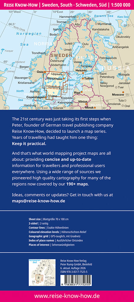 Reise Know-How maps are the ideal choice for car, motorbike or bicycle tours: This robust outdoor map, made of Polyart® , can withstand extreme weather and intensive use without the need for a protective cover. Thanks to its matte surface, it is easy to read even in strong sunlight and can be written on with a pencil and highlighter with ease. The map has a removable cardboard cover and is foldable and compact ideal for quick access in your bicycle bag, tank bag or glove compartment. The cartographic representation is precise, reliable and easy to read. The road map of Sweden, South is therefore precisely tailored to the needs of travelers.