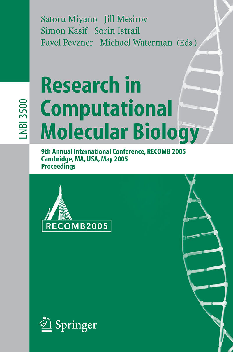 This volume contains the papers presented at the 9th Annual International Conference on Research in Computational Molecular Biology (RECOMB 2005), which was held in Cambridge, Massachusetts, on May 1418, 2005. The RECOMB conference series was started in 1997 b...This volume contains the papers presented at the 9th Annual International Conference on Research in Computational Molecular Biology (RECOMB 2005), which was held in Cambridge, Massachusetts, on May 1418, 2005. The RECOMB conference series was started in 1997 by Sorin Istrail, Pavel Pevzner and Michael Waterman. The list of previous meetings is shown below in the s- tion Previous RECOMB Meetings. RECOMB 2005 was hosted by the Broad Institute of MIT and Harvard, and Boston University's Center for Advanced - nomic Technology, and was excellently organized by the Organizing Committee Co-chairs Jill Mesirov and Simon Kasif. This year, 217 papers were submitted, of which the Program Committee - lected 39 for presentation at the meeting and inclusion in this proceedings. Each submission was refereed by at least three members of the Program Committee. After the completion of the referees' reports, an extensive Web-based discussion took place for making decisions. From RECOMB 2005, the Steering Committee decided to publish the proceedings as a volume of Lecture Notes in Bioinf- matics (LNBI) for which the founders of RECOMB are also the editors. The prominent volume number LNBI 3500 was assigned to this proceedings. The RECOMB conference series is closely associated with the Journal of Compu- tional Biology which traditionally publishes special issues devoted to presenting full versions of selected conference papers. The RECOMB Program Committee consistedof42members,aslistedonaseparatepage. Iwouldliketothank the RECOMB 2005 Program Committee members for their dedication and hard work.