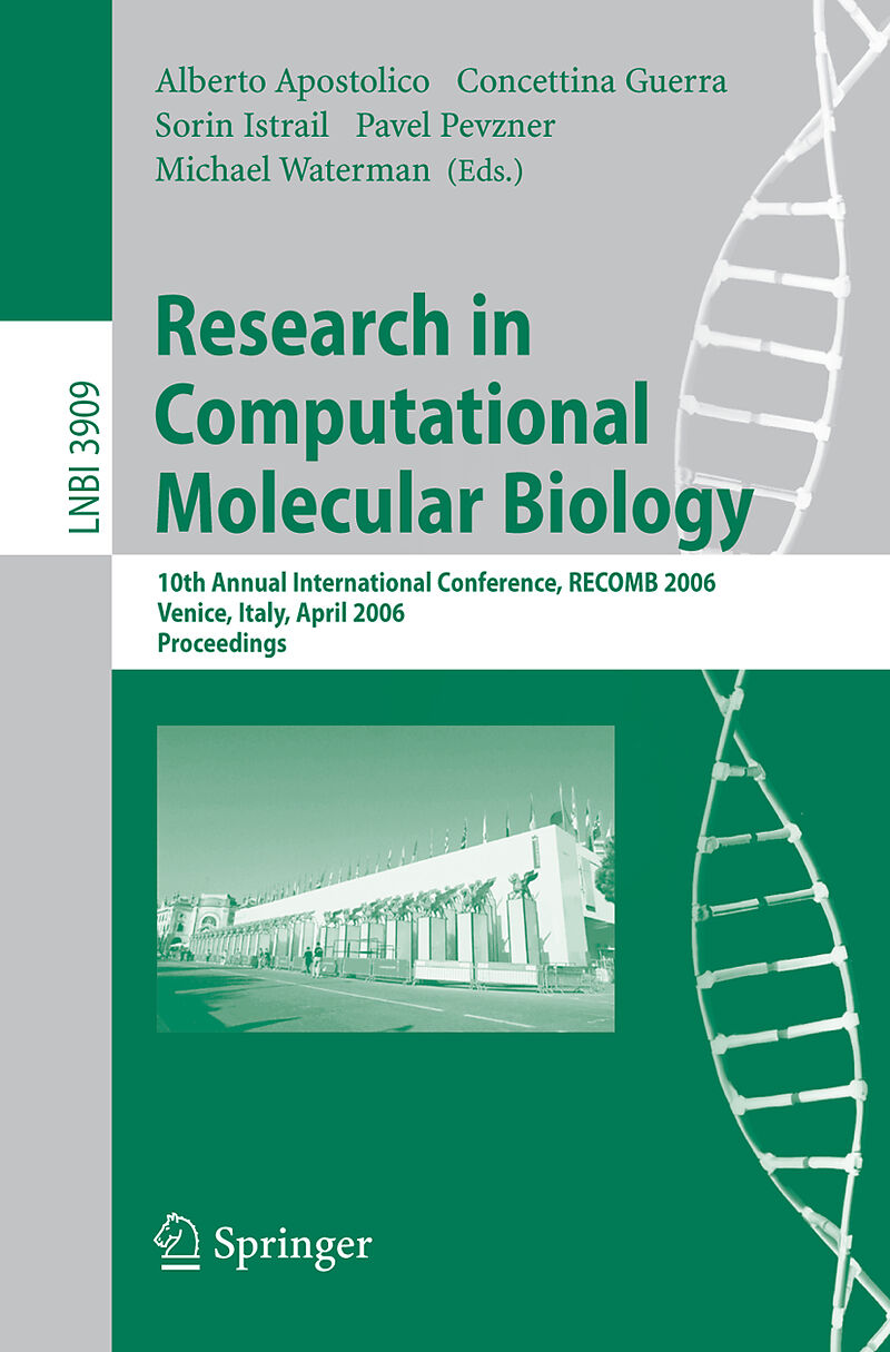 This volume contains the papers presented at the 10th Annual International Conference on Research in Computational Molecular Biology (RECOMB 2006), which was held in Venice, Italy, on April 2 5, 2006. The RECOMB conference serieswasstartedin1997bySorinIstrail,...This volume contains the papers presented at the 10th Annual International Conference on Research in Computational Molecular Biology (RECOMB 2006), which was held in Venice, Italy, on April 2 5, 2006. The RECOMB conference serieswasstartedin1997bySorinIstrail,PavelPevznerandMichaelWaterman. The table on p. VIII summarizes the history of the meetings. RECOMB 2006 was hosted by the University of Padova at the Cinema Palace of the Venice Convention Center, Venice Lido, Italy. It was organized by a committee chaired by Concettina Guerra. A special 10th Anniversary Program Committee was formed, by including the members of the Steering Committee and inviting all Chairs of past editions. The Program Committee consisted of the 38 members whose names are listed on a separate page. From212submissionsofhighquality,40paperswereselectedforpresentation atthemeeting,andtheyappearintheseproceedings.Theselectionwasbasedon reviewsandevaluationsproducedbytheProgramCommitteemembersaswellas byexternalreviewers,andonasubsequentWeb-basedPCopenforum.Following thedecisionmadein2005bytheSteeringCommittee,RECOMBProceedingsare published as a volume of Lecture Notes in Bioinformatics (LNBI), which is - editedbythefoundersofRECOMB.Traditionally,theJournalofComputational Biology devotes a special issue to the publication of archival versions of selected conference papers. RECOMB 2006 featured seven keynote addresses by as many invited spe- ers: Anne-Claude Gavin (EMBL, Heidelberg, Germany), David Haussler (U- versity of California, Santa Cruz, USA), Ajay K. Royyuru (IBM T.J. Watson ResearchCenter, USA), David Sanko? (University of Ottawa,Canada), Michael S. Waterman (University of Southern California, USA), Carl Zimmer (Science Writer, USA), Roman A. Zubarev (Uppsala University, Sweden). The Stanislaw Ulam Memorial Computational BiologyLecture was given by Michael S. Wat- man. A special feature presentation was devoted to the 10th anniversary and is included in this volume.