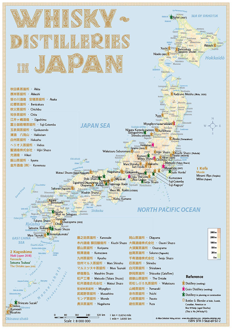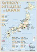 Die Whisky Distilleries Japan - Tasting Map 21x30cm zeigt zwei Japan-Landkarte. Die Whisky Destillerien sind in mehrere Kategorien unterteilt und auf der Karte farblich gekennzeichnet.