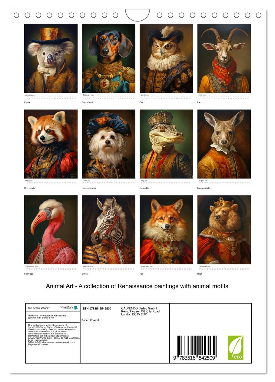 You love art and animals. Then discover the beauty and grace of animal art with our wall calendar. Animal Art is a unique collection of Renaissance paintings that show various animals in all their glory and diversity. Whether it is a majestic tiger, a playful ...