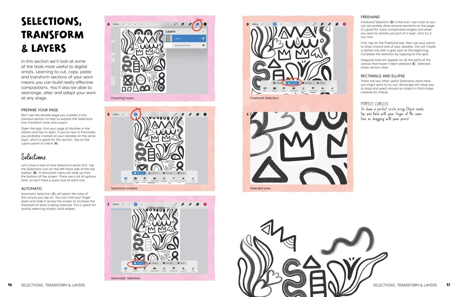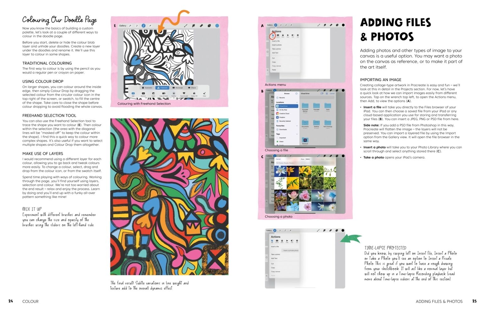 Procreate is my small-but-mighty friend! It's a powerful tool for creative people, condensed down to the size of a slim notebook. The interface is simple to use. However, behind every light tap or swipe of the screen is a vast library of resources designed to help you make art intuitively.I bought my first iPad Pro nearly six years ago. The single reason for the purchase was to download and install Procreate, a program I'd just started hearing about and was desperate to try for myself. I distinctly remember using it for the first time to draw a snowman, and how I wowed my handful of Instagram followers with the resulting Time-lapse video showing the process! Since then, I have used Procreate consistently for both personal, fun work and for professional design and illustration jobs. That's why I call it my friend! It's an app that is reliable, complex but easy to understand, travels by your side with the minimum of fuss, and helps you solve problems by constantly providing simple solutions.INSPIRATION AND PLAY!In this book, I would like to introduce you to the way I make my art and illustration using Procreate. It's a "how-to" book, but it's also a "how you might want to" guide. By this, I mean to say, feel free to follow the steps included within these pages, but I encourage you to experiment and explore other ways of working with the app.What this book is not, is a technical book. I'm a creative person - I often work spontaneously, without much of a plan. I use Procreate to help me create both impulsive, quick sketches, and also complex, meandering illustrations with many elements and layers. In short, I use it to solve problems in my work.With this in mind, I would like to pass on to you not a heavy technical manual, but rather, an inspirational workbook that encourages you to play, make mistakes and seek out your own way of using the app.