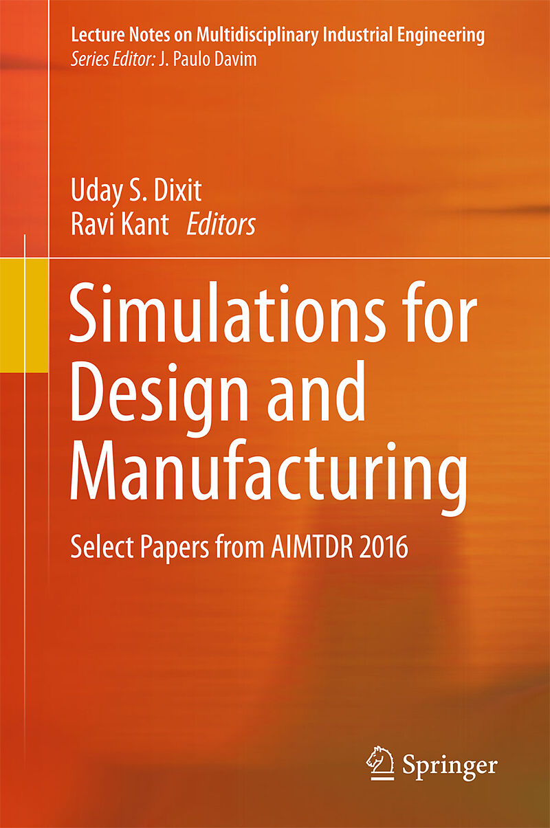 This book focuses on numerical simulations of manufacturing processes, discussing the use of numerical simulation techniques for design and analysis of the components and the manufacturing systems. Experimental studies on manufacturing processes are costly, t...This book focuses on numerical simulations of manufacturing processes, discussing the use of numerical simulation techniques for design and analysis of the components and the manufacturing systems. Experimental studies on manufacturing processes are costly, time consuming and limited to the facilities available. Numerical simulations can help study the process at a faster rate and for a wide range of process conditions. They also provide good prediction accuracy and deeper insights into the process. The simulation models do not require any pre-simulation, experimental or analytical results, making them highly suitable and widely used for the reliable prediction of process outcomes. The book is based on selected proceedings of AIMTDR 2016. The chapters discuss topics relating to various simulation techniques, such as computational fluid dynamics, heat flow, thermo-mechanical analysis, molecular dynamics, multibody dynamic analysis, and operational modal analysis. These simulation techniques are used to: 1) design the components, 2) to investigate the effect of critical process parameters on the process outcome, 3) to explore the physics of the process, 4) to analyse the feasibility of the process or design, and 5) to optimize the process. A wide range of advanced manufacturing processes are covered, including friction stir welding, electro-discharge machining, electro-chemical machining, magnetic pulse welding, milling with MQL (minimum quantity lubrication), electromagnetic cladding, abrasive flow machining, incremental sheet forming, ultrasonic assisted turning, TIG welding, and laser sintering. This book will be useful to researchers and professional engineers alike.