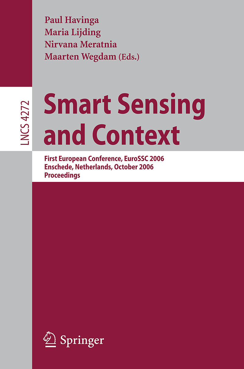 This volume contains the papers and posters selected for presentation at the First European Conference on Smart Sensing and Context (EuroSSC 2006) in Enschede, The Netherlands. EuroSSC 2006 was the ?rst conference of a series aiming at bringing together design...This volume contains the papers and posters selected for presentation at the First European Conference on Smart Sensing and Context (EuroSSC 2006) in Enschede, The Netherlands. EuroSSC 2006 was the ?rst conference of a series aiming at bringing together designers, engineers and researchers to explore two complementary viewpoints: A device-centric,technology-drivenview: concerning intelligent sensors,s- sor networks and information processing for a new generation of networked devices and environments. A service-centric, user-driven view: exploring architectures, techniques, and algorithms for context-aware and pro-active applications made possible by thedi?usionofambientcommunication,cooperatingobjects,andinteraction technologies. These subjects are active and relevant research areas in themselves, and there are several conferences that address them separately. EuroSSC 2006, however, considered them both, and especially the symbiosis between them, which we expect to result in very inspiring and interesting discussions, as well as new research ideas on how to combine them. The conference was organized in single tracks covering various issues ra- ing from intelligent sensors, sensor networks, context management and context awareness,andprivacy,toapplicationsandtestbeds. Organizingaconferencefor the ?rst time requires lots of preparations, such as ?nding a publisher, spons- ing organizations,and TPC members and most importantly attracting potential submitters. Fortunately, the amount and quality of the submissions were such that we were in the luxurious position to be able to accept only high quality and relevant papers. The conference attracted world wide attention and submissions came from ?ve continents. A total of 15 accepted full papers and 14accepted posters came from Asia, North America and Europe.