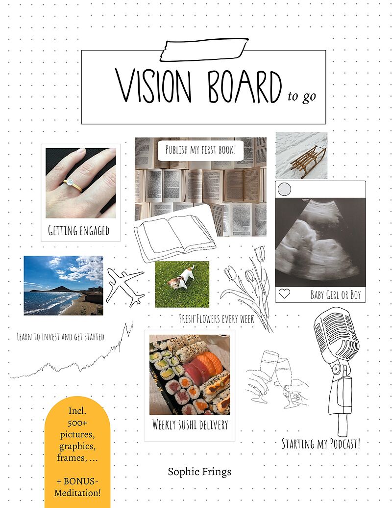 VISION BOARD SET: A vision board is a very powerful method with which you can manifest your dream life. The Vision Board to go - Motivational Book contains lots of appealing vision board pictures, line art graphics, letters, numbers, words etc. so that you can...VISION BOARD SET: A vision board is a very powerful method with which you can manifest your dream life. The Vision Board to go - Motivational Book contains lots of appealing vision board pictures, line art graphics, letters, numbers, words etc. so that you can create your own personal vision board. A real vision book! No more collecting all those magazines and newspapers! You don't even need a printer (but maybe some scissors and glue) ;) PRIVACY: Does it bother you that your vision board is on the wall at home or in the office for everyone to see? That won't happen with this Vision Board to go! Your private and personal goals remain hidden from others - and it still works. ON THE GO: With the Vision board to go - Motivational Book, you always have your inspiring vision board with you - as the name suggests! In practical paperback format, you can take it with you wherever you go. So relax and let your mind wander in your favorite café and create your personal vision board in this relaxed energy! GRATITUDE: If we focus on what is already there, our perspective changes. We become much more aware of what is positive and achievable than of mistakes or what is still missing. That's why the Vision board to go - Motivational Book has plenty of space for your daily gratitude practice! BONUS #1: Supportive coaching questions help you to find your own goals and manifest them. You'll also get tips on how to manifest with ease and inspiration for overcoming crises. BONUS #2: Deep Growth Meditation for the journey to your goals! The Vision Board to go - Motivational Book for Adults at a glance: - Practical vision board set with a total of over 500 pictures, line art graphics, frames, shapes as well as letters, words, numbers and much more! - Ingenious all-in-one solution: find your big goals, coach yourself, create a vision board and gratitude ritual to achieve your goals! - Suitable for all pens - Practical paperback format (17 x 22 cm, thats around 6.7 x 8.7 inches). - Perfect as a gift! - Inspirational journaling book for all your positive thoughts - Both lined pages - for those who like to write neatly and tidily - and blank pages to give free rein to your creativity.