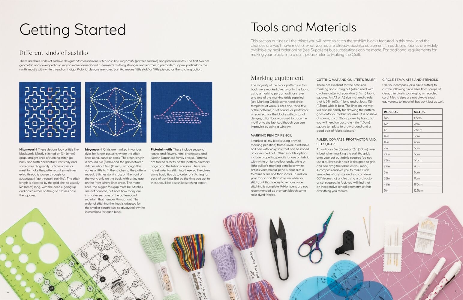 The idea of a sashiko 'block' for every day of the year started with a challenge from my sashiko course students a few years ago. For many years, I've taught sashiko by stitching patterns on 412in (11.5cm) squares, sewn together later into samplers - my friends in Yuza Sashiko Guild do this. Small squares are portable, sashiko can be stitched anywhere, and a big sashiko project is achievable if tackled in little pieces. My students learned different groups of patterns, drawing each onto their fabric, accenting sashiko with colour and growing their skills. But are there really enough different sashiko designs to stitch one every day for a year? The answer is, 'Yes'! I started looking deeply into sashiko designs, discovering many pattern variations that I hadn't explored before. Some larger patterns yield more than one block with different parts of the design. The 365 blocks arrange neatly into a 19 x 19 block format, plus four 'cornerstone' blocks to create the Sashiko 365 quilt top, the ultimate sashiko sampler quilt, measuring a generous 96in (244cm) square finished. There's even an extra block provided - perfect for leap year stitching! - to make a quilt label. These blocks are also ideal for your own smaller projects, from coasters to cushions, as well as bags, table linen, wall hangings, and 'sew' on. Most of the patterns can be extended or repeated to create larger pieces of sashiko, too. For my sample blocks, I chose a mid indigo blue and an easy to remember rainbow thread palette sequence, so you can see how the stitching lines progress and flow around each pattern. The blocks can be stitched in a more traditional white on dark indigo colourway, or in any colours you choose! Whether you stitch a block a day or tackle several at once is up to you, but as many people find, sashiko stitching every day can create a little oasis of calm. Before turning to the pattern directory to begin your first block, do read through the Getting Started section, which gives all the information you need, from essential equipment to prepping materials, as well as outlining all the techniques, like marking fabric and sashiko stitching basics. Everything you need to know to turn your blocks into a stunning quilt is covered in Making the Quilt. I hope you enjoy your sashiko year!