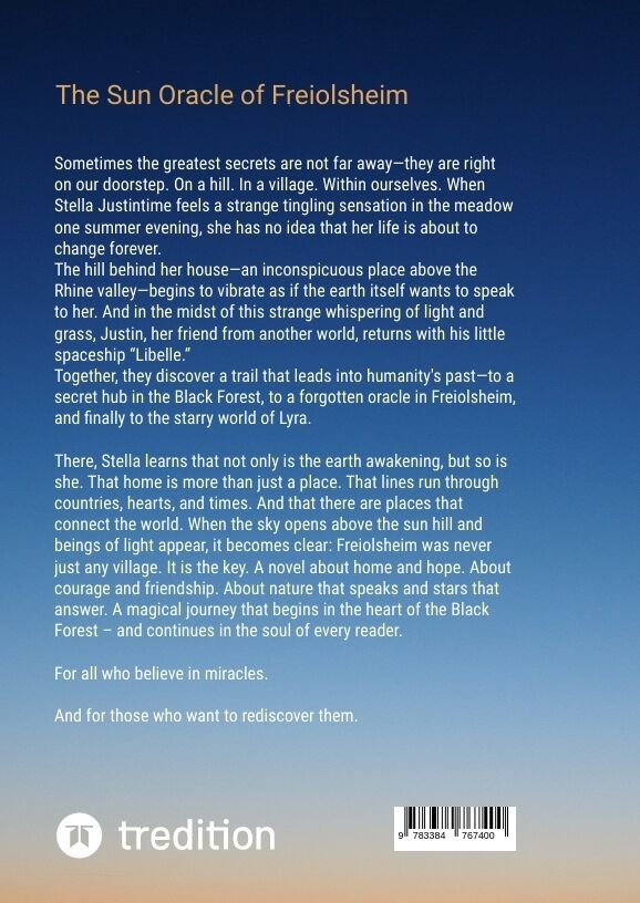 Sometimes the greatest secrets are not far away-they are right on our doorstep. On a hill. In a village. Within ourselves. When Stella Justintime feels a strange tingling sensation in the meadow one summer evening, she has no idea that her life is about to change forever. The hill behind her house-an inconspicuous place above the Rhine valley-begins to vibrate as if the earth itself wants to speak to her. And in the midst of this strange whispering of light and grass, Justin, her friend from another world, returns with his little spaceship "Libelle." Together, they discover a trail that leads into humanity's past-to a secret hub in the Black Forest, to a forgotten oracle in Freiolsheim, and finally to the starry world of Lyra. There, Stella learns that not only is the earth awakening, but so is she. That home is more than just a place. That lines run through countries, hearts, and times. And that there are places that connect the world. When the sky opens above the sun hill and beings of light appear, it becomes clear: Freiolsheim was never just any village. It is the key. A novel about home and hope. About courage and friendship. About nature that speaks and stars that answer. A magical journey that begins in the heart of the Black Forest - and continues in the soul of every reader. For all who believe in miracles. And for those who want to rediscover them.