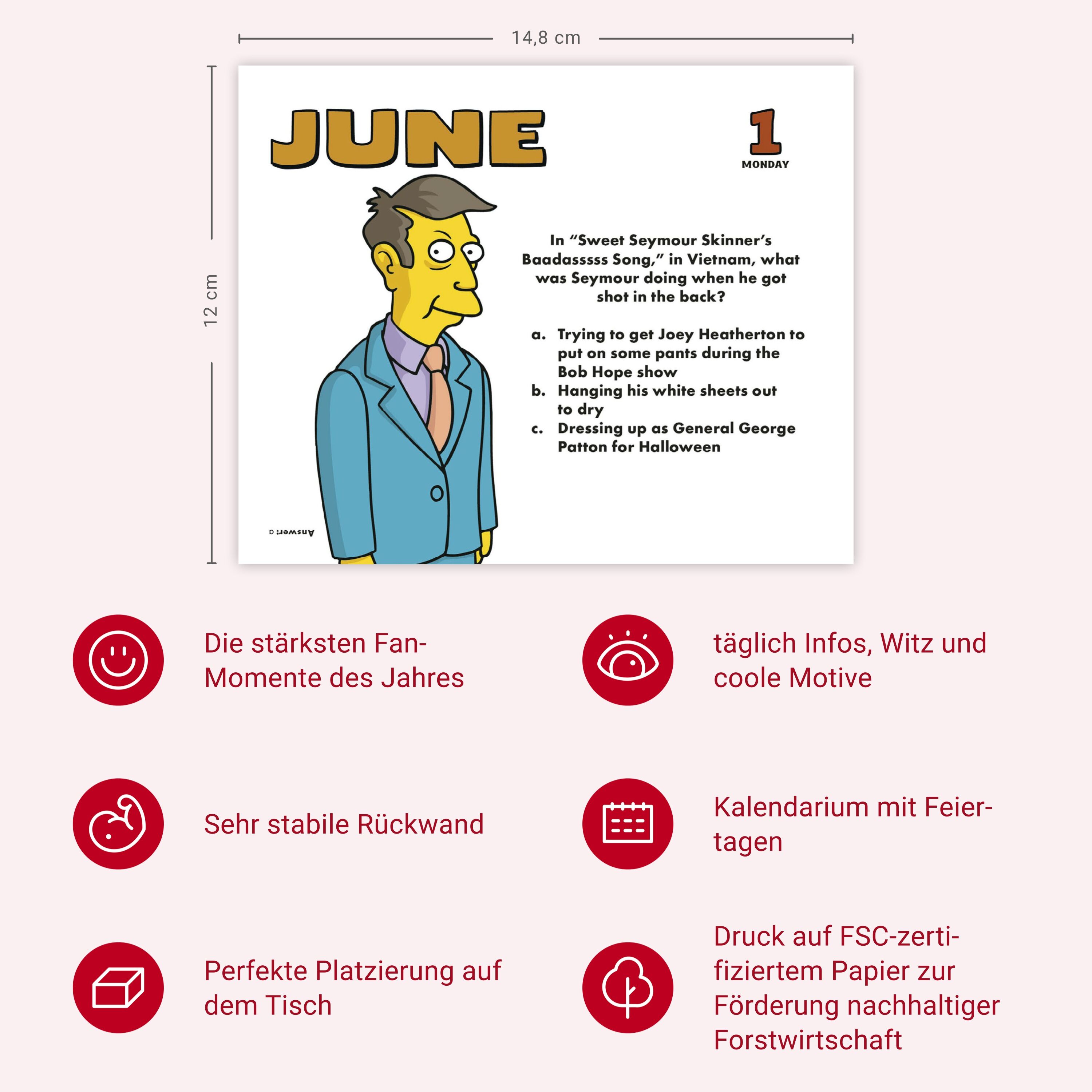 Ein Must-have für alle Fans der gelben Chaosfamilie! Mit diesem Tagesabreißkalender begleiten Homer, Marge, Bart, Lisa und Maggie Sie Tag für Tag durchs Jahr mit lustigen Fakten und interessanten Quizfragen zur Serie Klappentext - Ein Must-have für alle Fans d...