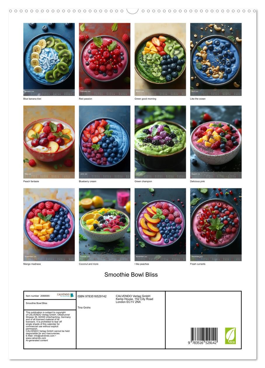 Smoothie Bowl Bliss (High Quality Premium Wall Calendar 2026 DIN A2 portrait),CALVENDO 12 Month Wall Calendar