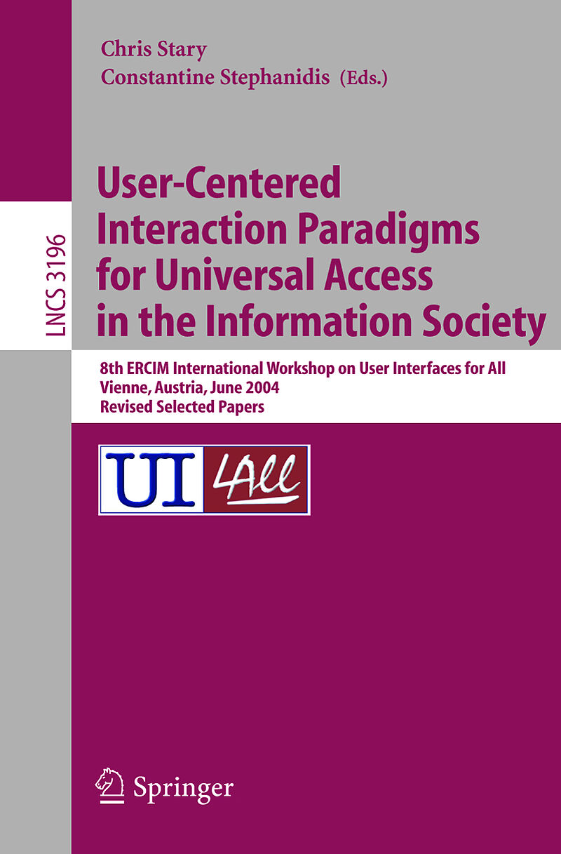 The 8th ERCIM Workshop User Interfaces for All was held in Vienna, Austria, on 2829 June 2004, building upon the results of the seven previous workshops held in Heraklion, Crete, Greece, 3031 October 1995; Prague, Czech Republic, 78 Nov- ber 1996; Obernai, Fra...The 8th ERCIM Workshop User Interfaces for All was held in Vienna, Austria, on 2829 June 2004, building upon the results of the seven previous workshops held in Heraklion, Crete, Greece, 3031 October 1995; Prague, Czech Republic, 78 Nov- ber 1996; Obernai, France, 34 November 1997; Stockholm, Sweden, 1921 October 1998; Dagstuhl, Germany, 28 November 1 December 1999; Florence, Italy, 2526 October 2000; and Paris (Chantilly), France, 2425 October 2002. The concept of User Interfaces for All targets a proactive realization of the - signforallprincipleinthe?eldofhuman-computerinteraction(HCI),andinvolvesthe developmentof user interfaces to interactiveapplicationsand e-services, which provide universalaccess andusabilityto potentiallyall users. In thetraditionofits predecessors, the 8th ERCIM Workshop User Interfaces for All aimed to consolidate recent work and to stimulate further discussion on the state of the art in User Interfaces for All and its increasing range of applications in the upcoming Information Society. The emphasis of the 2004 event was on User-Centered Interaction Paradigms for Universal Access in the Information Society. The requirement for user-centered u- versal access stems from the growing impact of the fusion of the emerging techno- gies and from the different dimensions of diversity that are intrinsic to the Information Society. These dimensions become evident when considering the broad range of user characteristics, the changing nature of human activities, the variety of contexts of use, the increasing availability and diversi?cation of information, knowledge sources and e-services, the proliferation of technological platforms, etc.