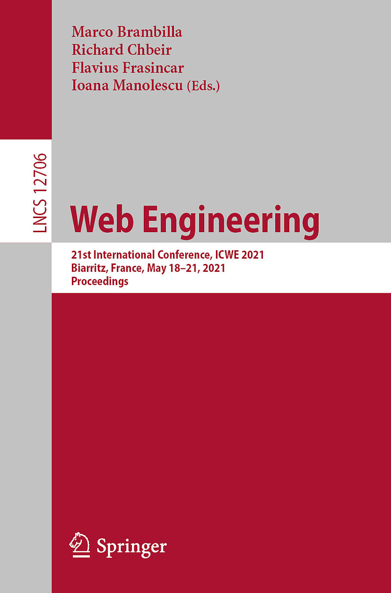 This book constitutes the proceedings of the 21st International Conference on Web Engineering, ICWE 2021, which was supposed to be held in Biarritz, France, in May 2021. Due to the corona pandemic the conference changed to a virtual format. The total of 22 ful...This book constitutes the proceedings of the 21st International Conference on Web Engineering, ICWE 2021, which was supposed to be held in Biarritz, France, in May 2021. Due to the corona pandemic the conference changed to a virtual format. The total of 22 full and 13 short contributions presented in this volume were carefully reviewed and selected from 128 submissions. The book also contains 6 demonstration, 1 poster, 3 PhD, and 3 tutorial papers. The papers were organized in topical sections named: Semantic Web; social Web; Web modeling and engineering; Web big data and data analytics; Web mining and knowledge extraction; Web of Things; Web programming; Web user interfaces; PhD symposium; posters and demonstrations; and tutorials.