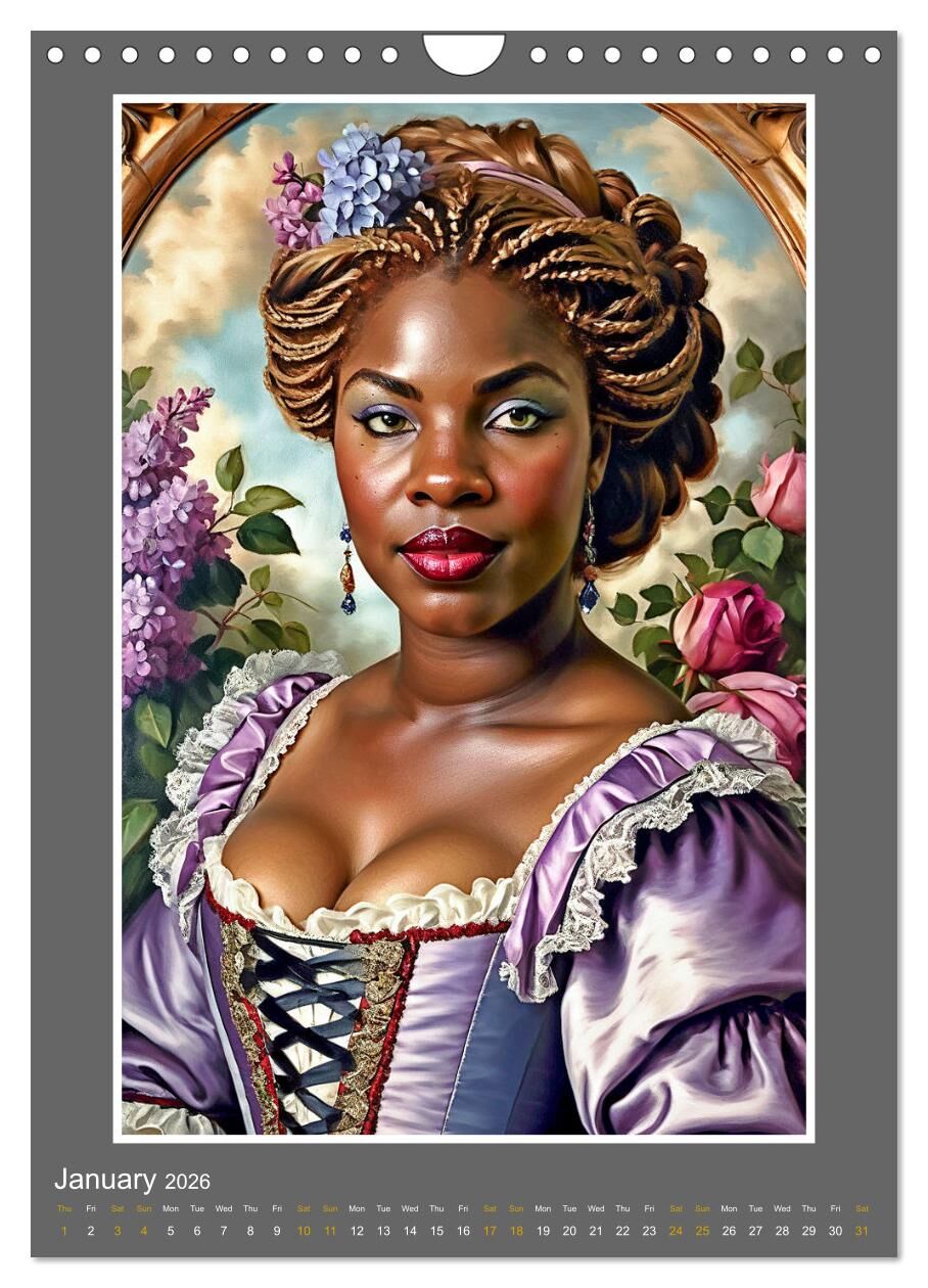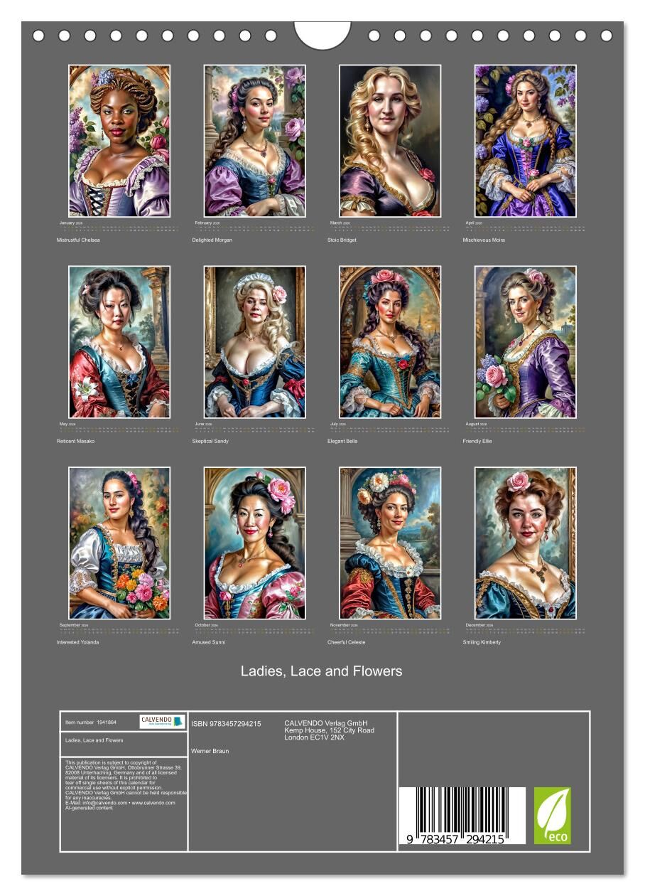 In this calendar, the monthly images reveal artfully crafted portraits of women resplendent in magnificent Baroque costumesevery detail designed with love and artificial intelligence. Each image perfectly captures the grace and style of this era, from the opul...