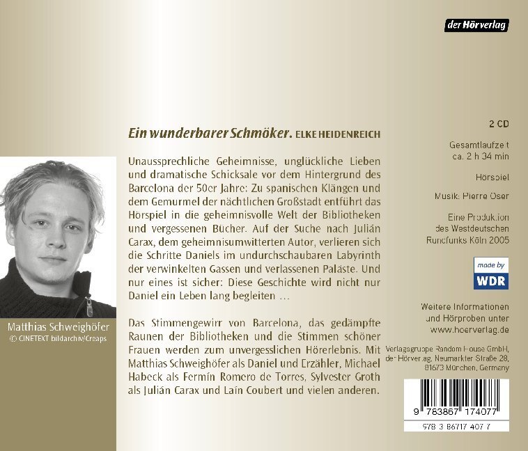 Unaussprechliche Geheimnisse, unglückliche Lieben und dramatische Schicksale vor dem Hintergrund des Barcelona der 50er Jahre: Zu spanischen Klängen und dem Gemurmel der nächtlichen Großstadt entführt das Hörspiel in die geheimnisvolle Welt der Bibliotheken un...| 0 |