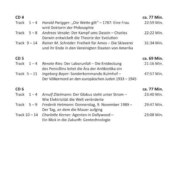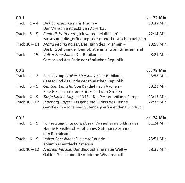Spannende Streifzüge durch die Weltgeschichte von der Vorzeit bis zur Gegenwart. Von großen Erfindungen, Entdeckungen und Eroberungen wird ebenso erzählt wie von stillen Momenten, die den Weg der Menschheit geprägt haben. Die jungen Hörer erfahren, wie der Men...