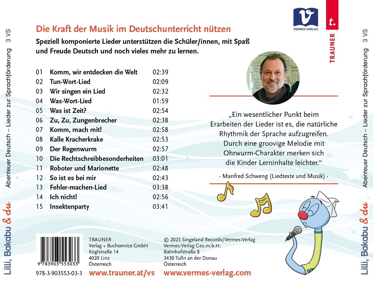 Die Kraft der Musik im Deutschunterricht nützen! 15 speziell komponierte Lieder unterstützen die Schüler:innen, mit Spaß und Freude Deutsch und noch vieles mehr zu lernen. Musik und Bewegung sind bei Lilli, Bakabu & du die verlässlichen Partner auf dem Weg...