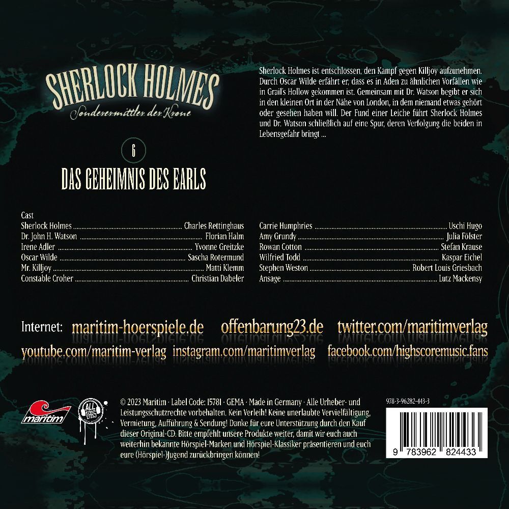 Sherlock Holmes als Sonderermittler in neuen Fällen! Eine Hörspielperle von All Ears erschienen im Maritim Verlag! Sherlock Holmes ist entschlossen, den Kampf gegen Killjoy aufzunehmen. Durch Oscar Wilde erfährt er, dass es in Aden zu ähnlichen Vorfällen wie i...| 1 | Sherlock Holmes: Das Geheimnis Des Earls (Folge 6) | 02:46 | |