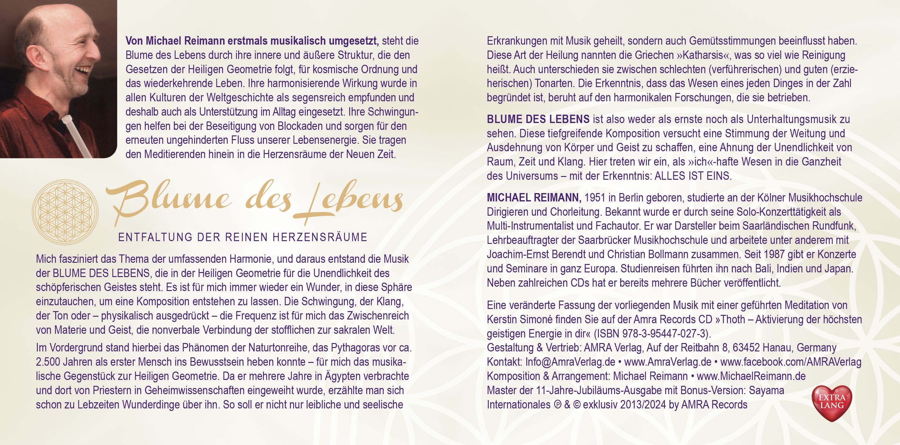 MICHAEL REIMANN ÜBER "BLUME DES LEBENS" Dies ist eine erweiterte Komposition, die aus einer früheren Arbeit hervorging. Inspiriert wurde die ursprüngliche Komposition, eingespielt für die CD "Thoth Aktivierung der höchsten geistigen Energie in dir", von den ge...