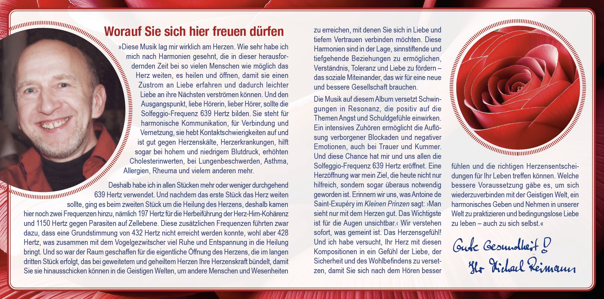 »Die Musik für HERZÖFFNUNG lag mir wirklich am Herzen. Wie sehr habe ich mich nach Harmonien gesehnt, die in dieser herausfordernden Zeit bei so vielen Menschen wie möglich das Herz weiten, es heilen und öffnen, damit sie einen Zustrom an Liebe erfahren und dadurch leichter Liebe an ihre Nächsten verströmen können. Und den Ausgangspunkt, liebe Hörerin, lieber Hörer, sollte die Solfeggio-Frequenz 639 Hertz bilden. Sie steht für harmonische Kommunikation, für Verbindung und Vernetzung, sie hebt Kontaktschwierigkeiten auf und ist gut gegen Herzenskälte, Herzerkrankungen, hilft bei hohem und niedrigem Blutdruck, erhöhten Cholesterinwerten, bei Lungenbeschwerden, Asthma, Allergien, Rheuma und vielem mehr. Deshalb habe ich in allen Stücken mehr oder weniger durchgehend 639 Hertz verwendet. Und nachdem das erste Stück das Herz weiten sollte, ging es beim zweiten Stück um die Heilung des Herzens, deshalb kamen hier noch zwei Frequenzen hinzu, nämlich 197 Hertz für die Herbeiführung der Herz-Hirn-Kohärenz und 1150 Hertz gegen Parasiten auf Zellebene. Diese zusätzlichen Frequenzen führten zwar dazu, dass eine Grundstimmung von 432 Hertz nicht erreicht werden konnte, wohl aber 428 Hertz, was zusammen mit dem Vogelgezwitscher viel Ruhe und Entspannung in die Heilung bringt. Und so war der Raum geschaffen für die eigentliche Öffnung des Herzens, die im langen dritten Stück erfolgt, das bei geweitetem und geheiltem Herzen Ihre Herzenskraft bündelt, damit Sie sie hinausschicken können in die Geistigen Welten, um andere Menschen und Wesenheiten zu erreichen, mit denen Sie sich in Liebe und tiefem Vertrauen verbinden möchten. Diese Harmonien sind in der Lage, sinnstiftende und tiefgehende Beziehungen zu ermöglichen, Verständnis, Toleranz und Liebe zu fördern das soziale Miteinander, das wir für eine bessere Gesellschaft brauchen. Die Musik auf diesem Album versetzt Schwingungen in Resonanz, die positiv auf die Themen Angst und Schuldgefühle einwirken. Ein intensives Zuhören ermöglicht die Auflösung verborgener Blockaden und negativer Emotionen, auch bei Trauer und Kummer. Und diese Chance hat mir und uns allen die Solfeggio-Frequenz 639 Hertz eröffnet. Eine Herzöffnung war mein Ziel, die heute nicht nur hilfreich, sondern sogar überaus notwendig geworden ist. Erinnern wir uns, was Antoine de Saint-Exupéry im Kleinen Prinzen sagt: Man sieht nur mit dem Herzen gut. Das Wichtigste ist für die Augen unsichtbar. Wir verstehen sofort, was gemeint ist. Das Herzensgefühl! Und ich habe versucht, Ihr Herz mit diesen Kompositionen in ein Gefühl der Liebe, der Sicherheit und des Wohlbefindens zu versetzen, damit Sie sich nach dem Hören besser fühlen und die richtigen Herzensentscheidungen für Ihr Leben treffen können. Welche bessere Voraussetzung gäbe es, um sich wiederzuverbinden mit der Geistigen Welt, ein harmonisches Geben und Nehmen in unserer Welt zu praktizieren und bedingungslose Liebe zu leben auch zu sich selbst.«