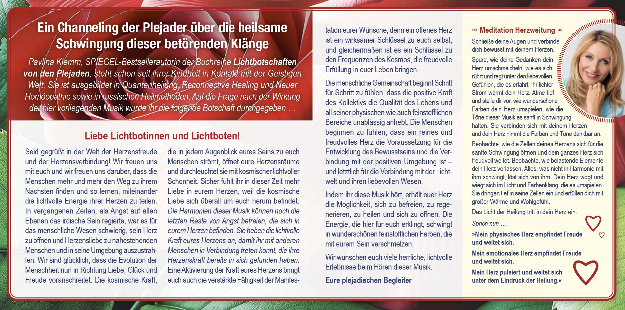 Das Booklet enthält eine gechannelte Botschaft der SPIEGEL-Bestsellerautorin und Heilerin Pavlina Klemm sowie drei Meditationen. Die Musik arbeitet mit der Solfeggio-Frequenz 639 Hertz: Herzweitung - Herzheilung - Herzöffnung