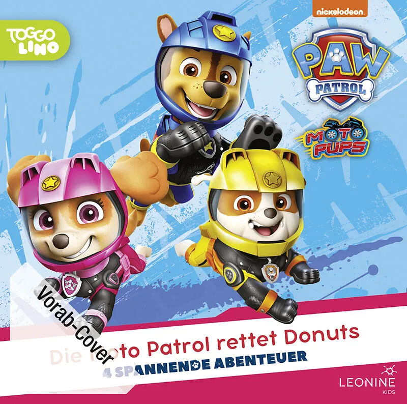 PAW Patrol: Das sind Chase, Marshall, Rocky, Zuma, Rubble und Skye. Mit ihren speziellen Fähigkeiten und coolen Fahrzeugen schaffen sie es, jede Mission zu bewältigen! Die Ruff-Ruff-Gang sorgt wieder für Aufregung in der Abenteuerbucht. Sie stehlen den Donut-B...| 1 | Die Moto Patrol rettet Donuts / Die Moto Patrol rettet die Chaos-Kätzchen / Der Pflück-Roboter / Draufgänger-Vogel X | 03:42 | |