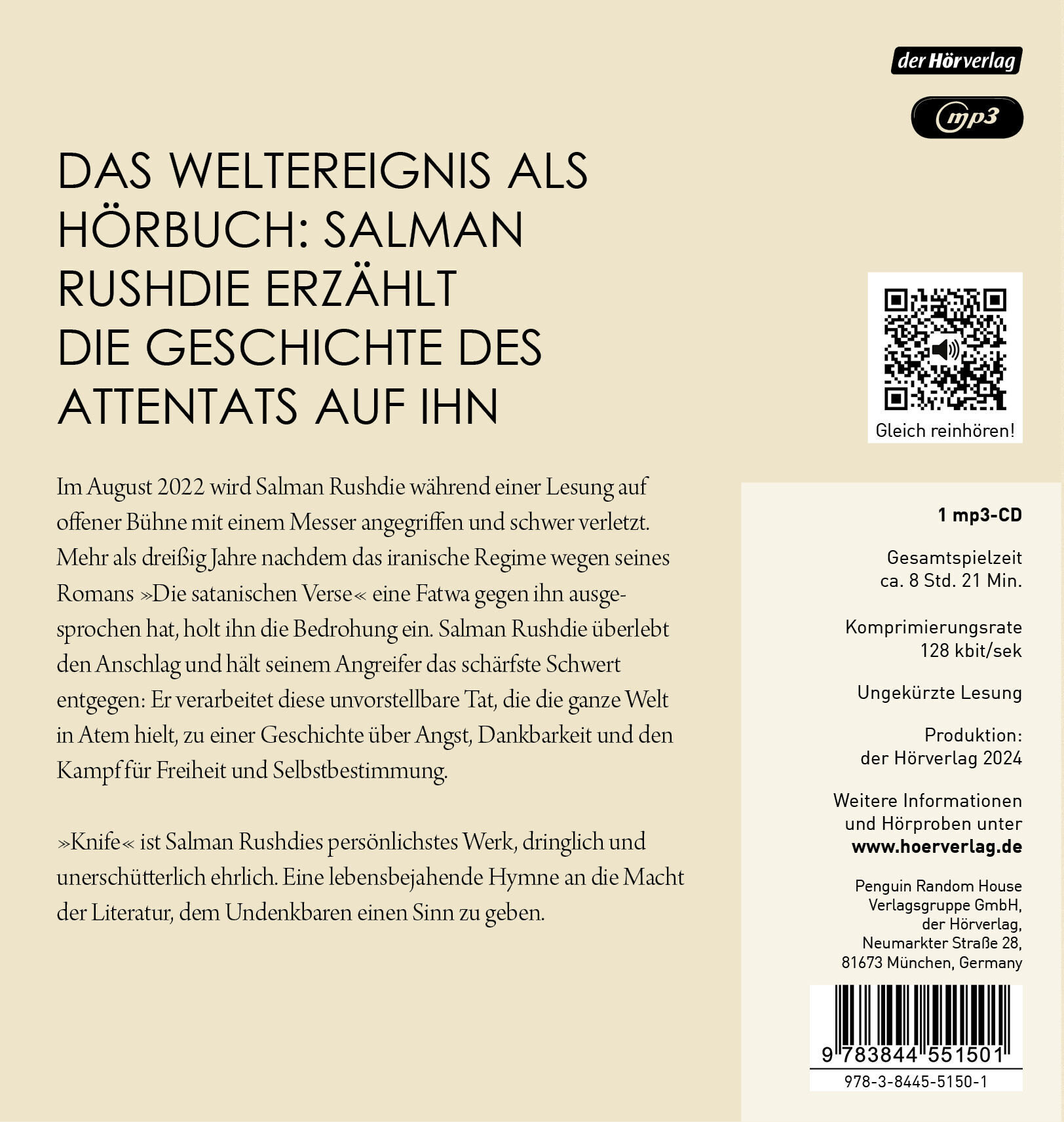 Das Weltereignis als Hörbuch: Salman Rushdie erzählt die Geschichte des Attentats auf ihn Im August 2022 wird Salman Rushdie während einer Lesung auf offener Bühne mit einem Messer angegriffen und schwer verletzt. Mehr als dreißig Jahre nachdem das iranische R...