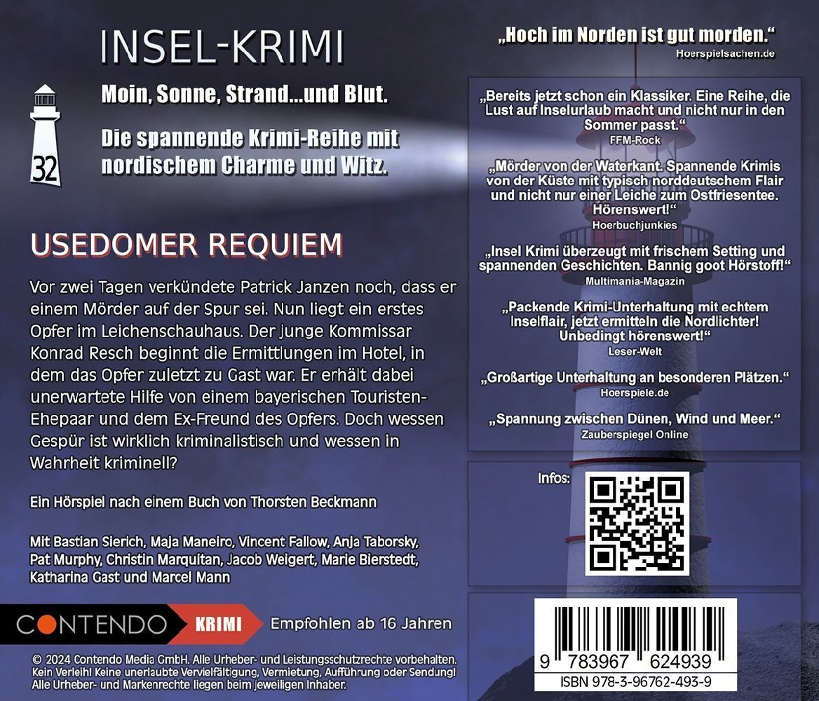 Moin, Sonne, Strand...und Blut. Die spannende Krimi-Reihe mit nordischem Charme und Witz. Vor zwei Tagen verkündete Patrick Janzen noch, dass er einem Mörder auf der Spur sei. Nun liegt ein erstes Opfer im Leichenschauhaus. Der junge Kommissar Konrad Resch beg...| 1 | Insel-Krimi: Usedomer Requiem (Folge 32) | 00:53 | |