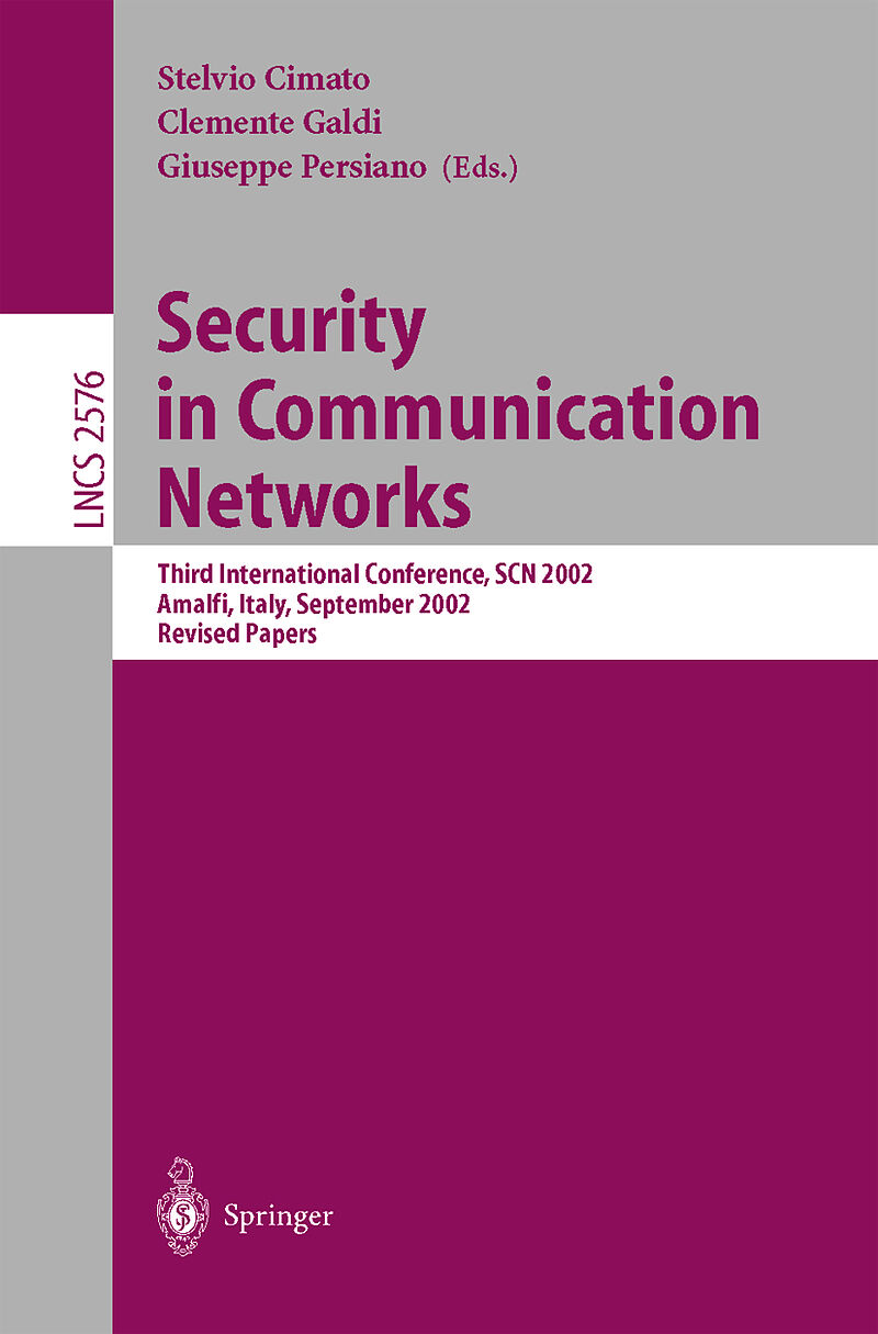The Third International Conference on Security in Communication Networks 2002 (SCN 2002) was held in the Salone Morelli of the Civic Museum of Amal?, Italy, September 11 13, 2002. The conference takes place every three years (p- vious ones were held in 1996 an...