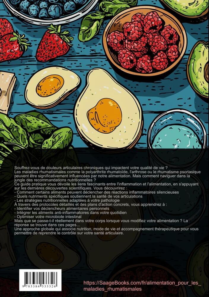 Ce guide pratique sur l'alimentation anti-inflammatoire propose une approche nutritionnelle approfondie pour les personnes atteintes de maladies rhumatismales.La première partie explique les principes fondamentaux de la médecine nutritionnelle et le lien ...Ce guide pratique sur l'alimentation anti-inflammatoire propose une approche nutritionnelle approfondie pour les personnes atteintes de maladies rhumatismales.La première partie explique les principes fondamentaux de la médecine nutritionnelle et le lien entre l'alimentation et les inflammations silencieuses. Elle détaille les processus métaboliques spécifiques aux maladies rhumatismales et l'importance de la santé intestinale.La deuxième section présente des concepts nutritionnels adaptés à chaque pathologie :- Polyarthrite rhumatoïde- Arthrose- Rhumatisme psoriasiqueVous découvrirez les aliments anti-inflammatoires bénéfiques ainsi que ceux à limiter pour chaque condition.La partie pratique guide le lecteur dans la mise en place d'une alimentation pour les rhumatismes avec :- Des protocoles alimentaires personnalisables- Des plans de repas hebdomadaires- Des conseils pour l'organisation quotidienneUne section est dédiée à l'alimentation pour maladies auto-immunes, abordant :- Les aliments renforçant le système immunitaire- Les stratégies d'élimination- La complémentation nutritionnelleLe livre se termine par des recommandations sur les mesures d'accompagnement :- Activité physique adaptée- Gestion du stress- Suivi thérapeutiqueCet ouvrage sur l'alimentation et les rhumatismes offre des solutions concrètes pour gérer les inflammations par une approche nutritionnelle ciblée.Ce livre a été créé en utilisant des technologies innovantes telles que l'Intelligence Artificielle ainsi que des outils spécialement développés - par exemple, pour la recherche d'idées, la recherche d'informations, l'écriture, la relecture, l'assurance qualité et la conception d'illustrations décoratives.Ainsi, nous souhaitons vous offrir une expérience de lecture particulièrement cohérente, moderne et d'une qualité encore supérieure.